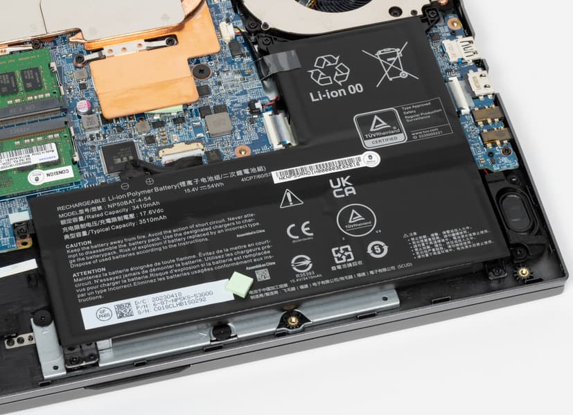 Системная плата разрезная, трехкомпонентная. Она состоит из главного модуля и двух сателлитов: на первом (на фото — справа) располагаются оба порта USB Type-A и аудиоразъемы; на переднем (на фото — внизу) — блок сигнальных индикаторов передней панели. Возможности апгрейда типичны для игровых ноутбуков: можно увеличить доступный объем оперативной памяти (скажем, установить 64 ГБ в двух модулях по 32 ГБ), заменить твердотельный накопитель в первом слоте M.2 или добавить еще один во второй свободный слот. Эти операции производятся очень быстро и традиционно не вызывают затруднений. Чуть больше времени потребует замена батареи. Последняя крепится к корпусу винтами и обладает собственным коннектором, вставленным в ответный разъем на системной плате, поэтому для замены не потребуются ни паяльник, ни специальный инструмент.