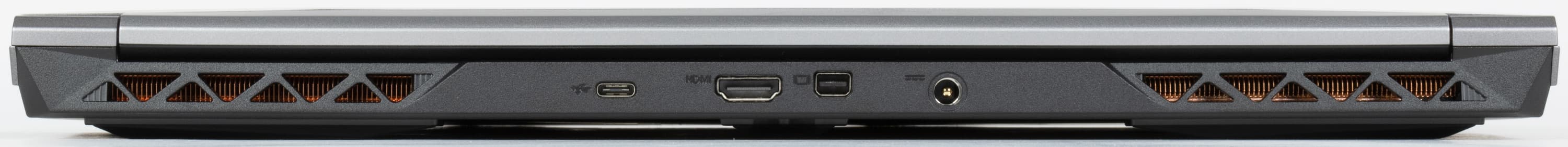 Справа и слева на задней панели видны решетки двух выпускных трактов системы охлаждения, через которые наружу выбрасывается нагретый воздух. Между ними слева направо расположены разъем USB Type-C, видеовыходы HDMI 2.0 и Mini-DisplayPort 1.4 и разъем для подключения адаптера питания.