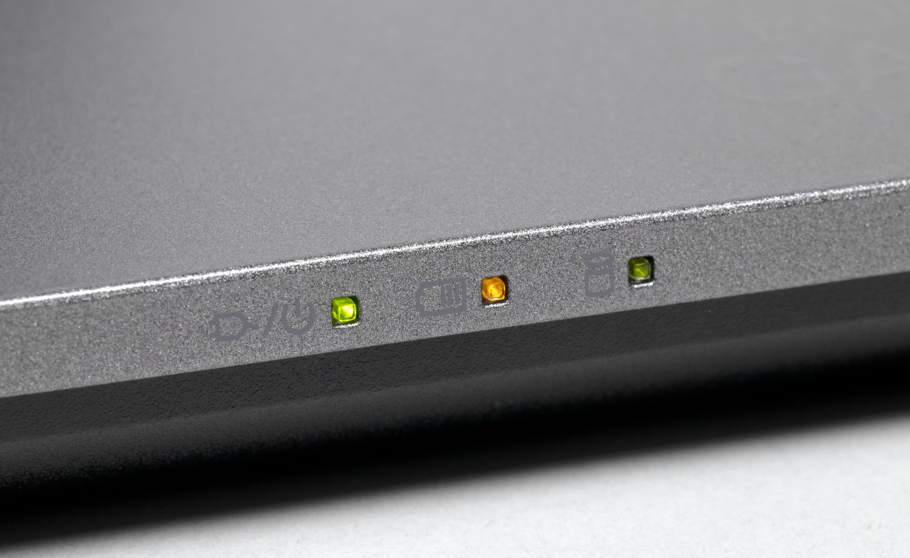 Левый светодиод группы уведомляет о подключении внешнего питания, средний указывает на состояние аккумулятора, а правый сигнализирует об активности системного накопителя.