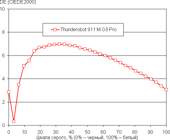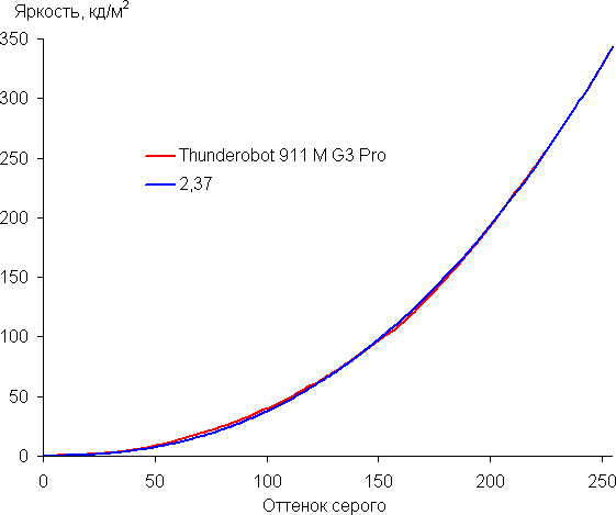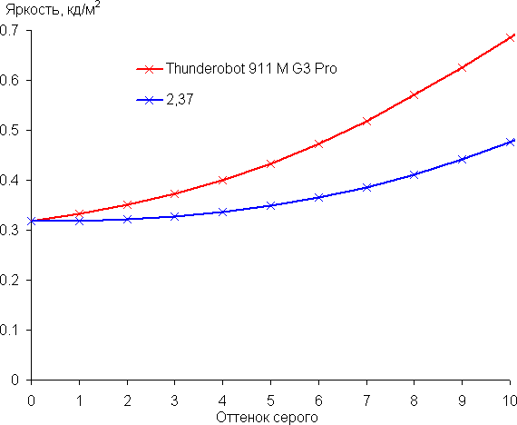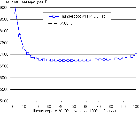 В ноутбуке Thunderobot 911 M G3 Pro используется 15,6-дюймовая IPS-матрица с разрешением 1920×1080 пикселей (Full HD) (отчет edid-decode). Ее поверхность жесткая, полуматовая, но зеркальность выражена. Специальные антибликовые покрытия или фильтр отсутствуют, нет и воздушного промежутка. При питании от сети или от батареи и при ручном управлении (поскольку автоматической подстройки по датчику освещенности нет) максимальное значение яркости составило 344 кд/м² в центре экрана на белом фоне. Максимальная яркость довольно высокая, поэтому за ноутбуком с некоторым успехом можно работать ясным днем на открытом воздухе, если расположиться в тени.