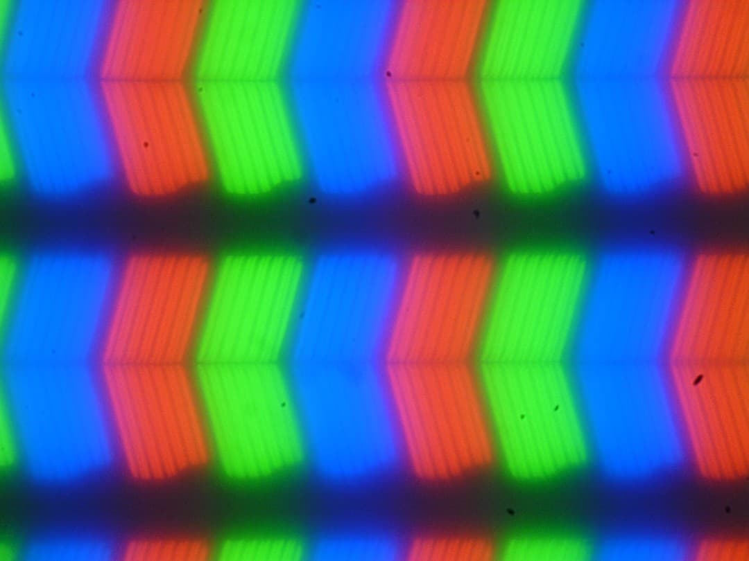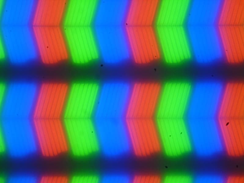 В этом ноутбуке используется матрица типа IPS. Микрофотографии демонстрируют типичную для IPS структуру субпикселей (черные точки — это пыль на матрице фотоаппарата):