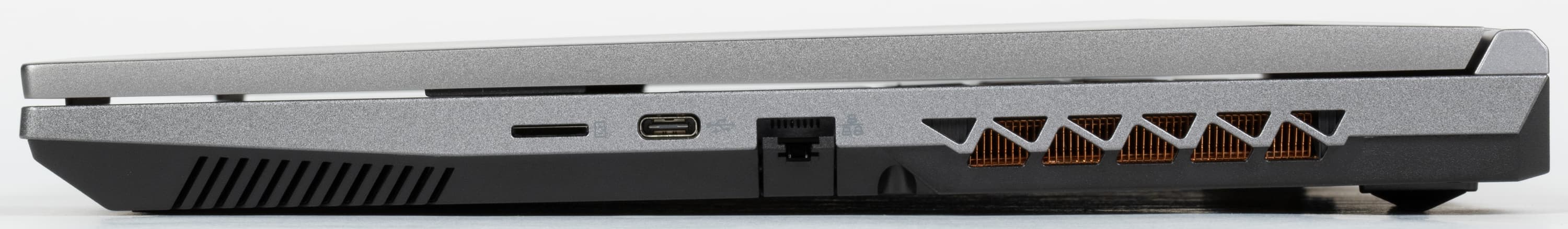 Справа на боковой поверхности имеются картовод для карт памяти mciroSD, еще один порт USB Type-C, розетка RJ-45 для подключения кабеля локальной сети Ethernet и решетка выходного тракта системы охлаждения.