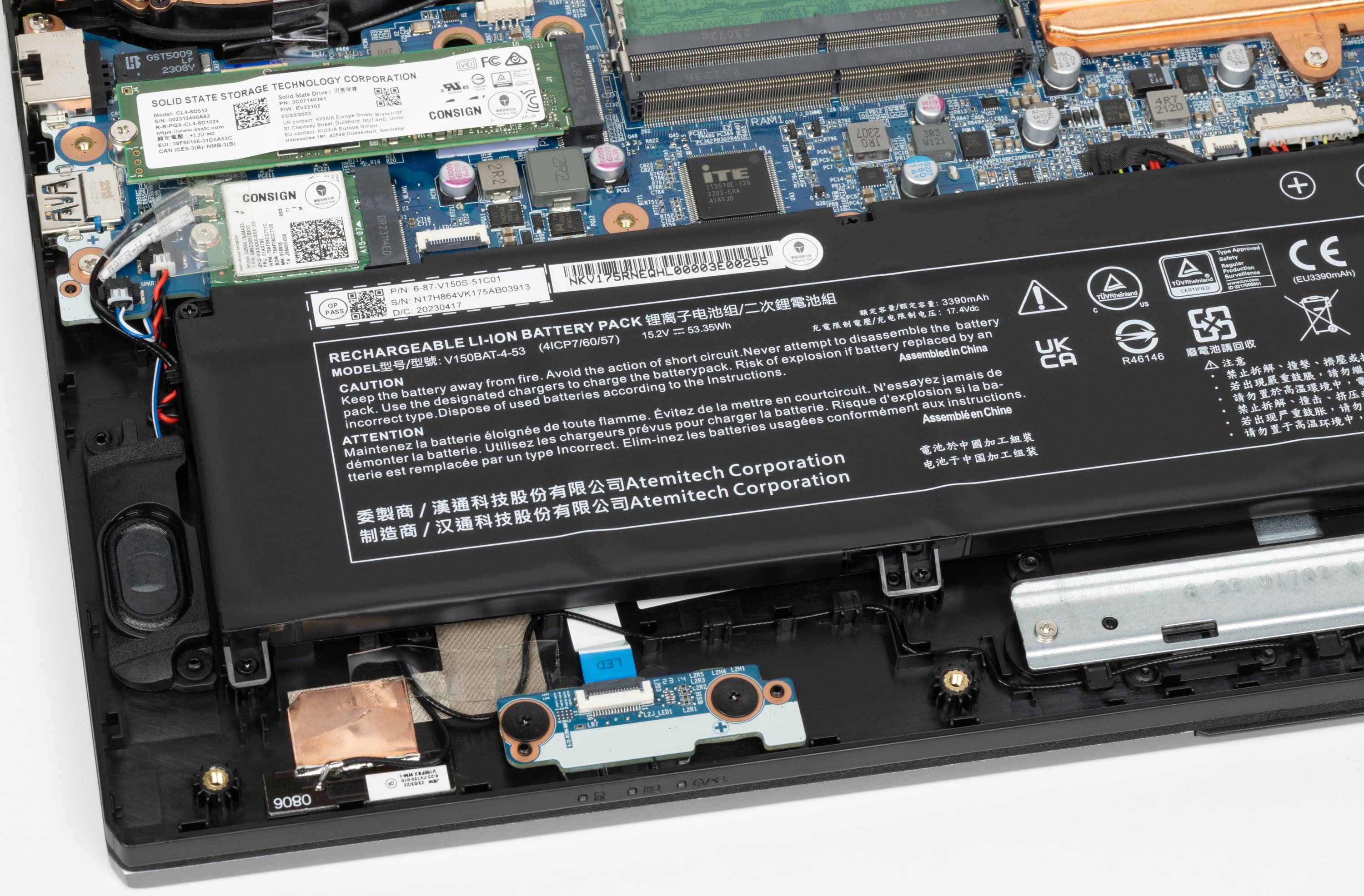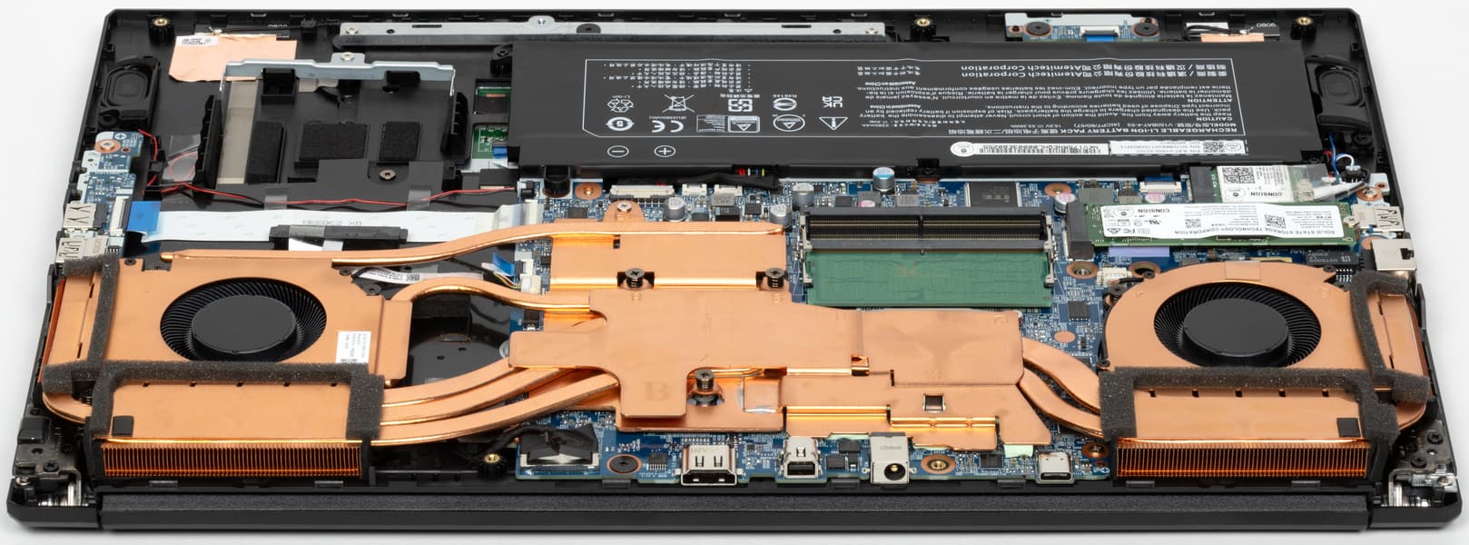 Здесь по величине над прочими доминируют компоненты системы охлаждения и аккумулятор. Системная плата разрезная, трехкомпонентная, состоит из главного модуля и двух сателлитов: бокового (на фото — справа), несущего на себе конструктивы портов USB Type-A и аудиоразъемы, и переднего (на фото — внизу слева), содержащего блок сигнальных индикаторов. Перед левым кулером предусмотрен отсек для установки традиционного ноутбучного винчестера или SSD форм-фактора 2,5 дюйма с интерфейсом SATA. Качество сборки оставляет желать лучшего. Слабыми узлами предстают сильно вытянутые шлейфы соединений бокового сателлита с системной платой, а также аудиокабель, уложенный с образованием петель и пересечений. Во многих местах использованы заклейки липкой лентой. В частности, именно ею (а не винтами) прикреплен комбинированный разъем SATA и питания. Для защиты от контакта с днищем и в качестве термоизоляции на оба кулера наклеены поролоновые прокладки.