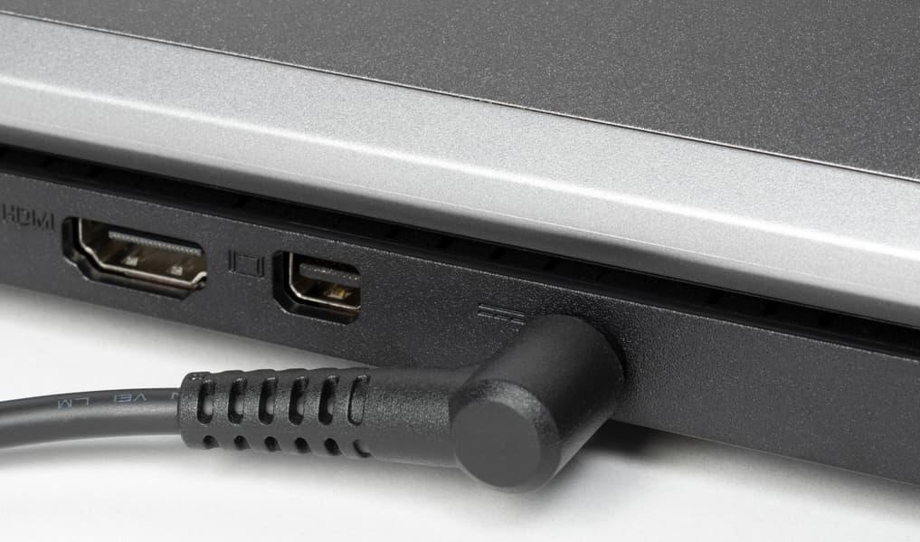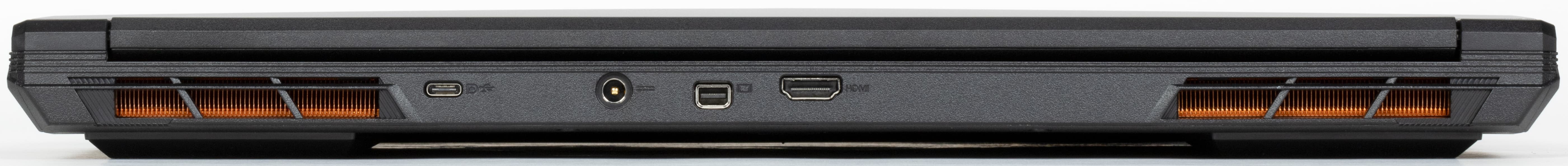 Справа и слева на задней панели видны решетки двух выпускных трактов системы охлаждения, через которые наружу выбрасывается нагретый воздух. Между ними слева направо расположены порт USB Type-C, коаксиальный разъем для подключения адаптера питания, видеовыходы Mini-DisplayPort и HDMI.