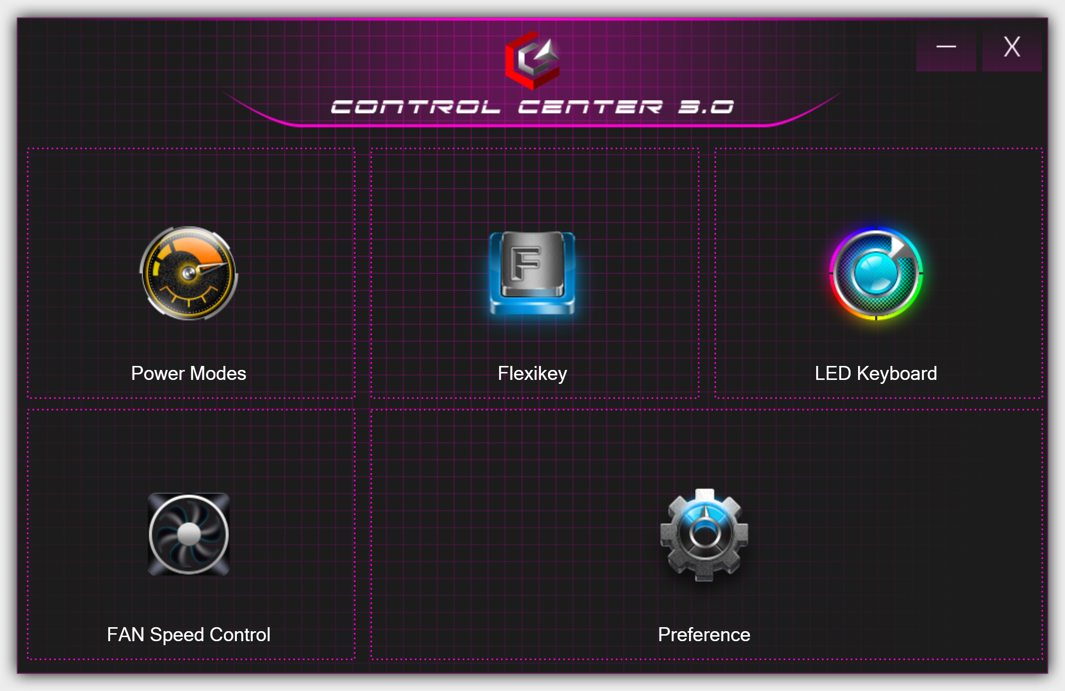 Начальный экран содержит отсылки к пяти функциональным блокам: выбору режима мощности (Power Modes), переназначению клавиш (FlexiKey), управлению подсветкой клавиатуры (LED Keyboard), настройке скорости вентиляторов (Fan Speed Control) и некоторым дополнительным опциям (Preference).