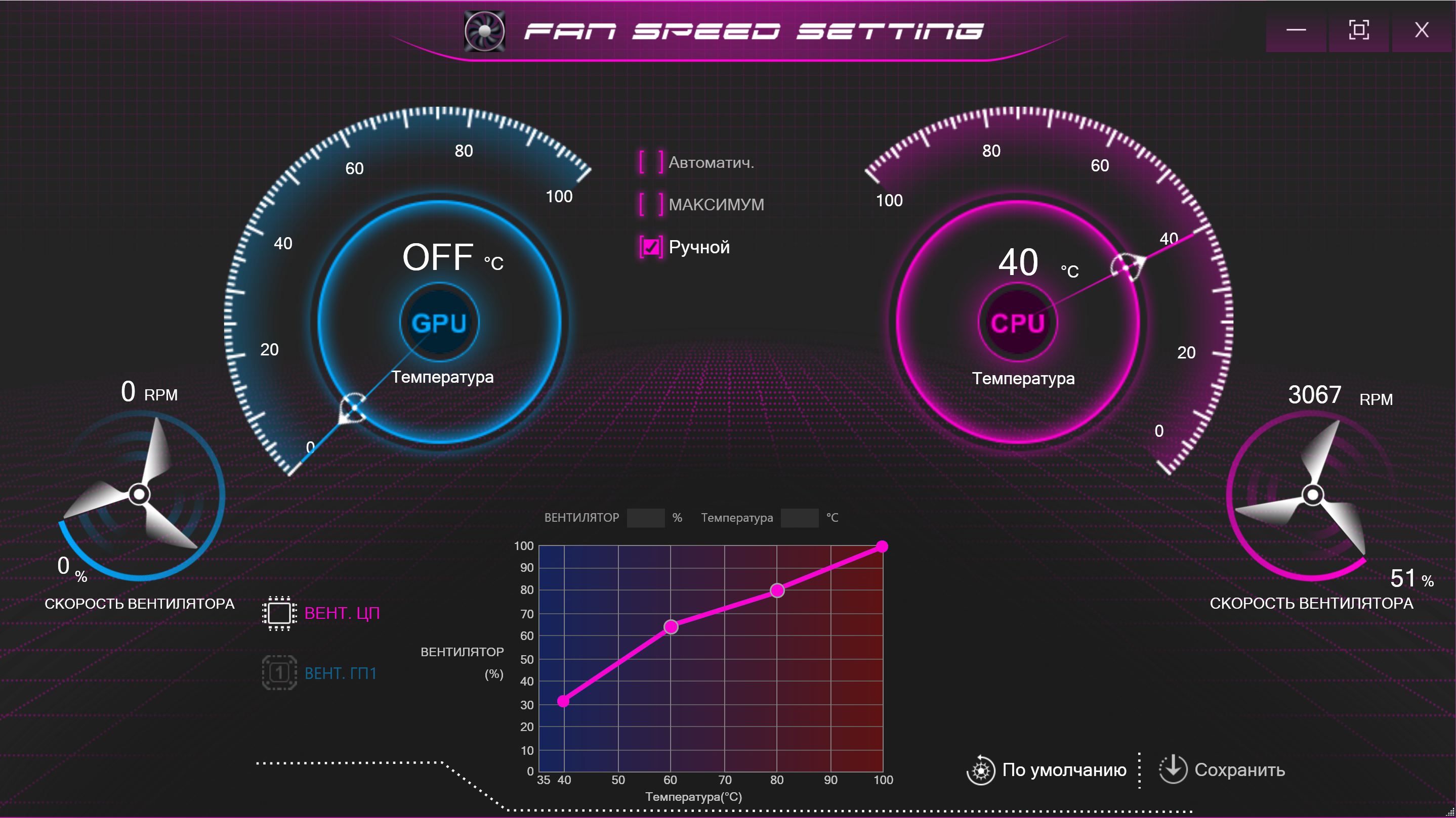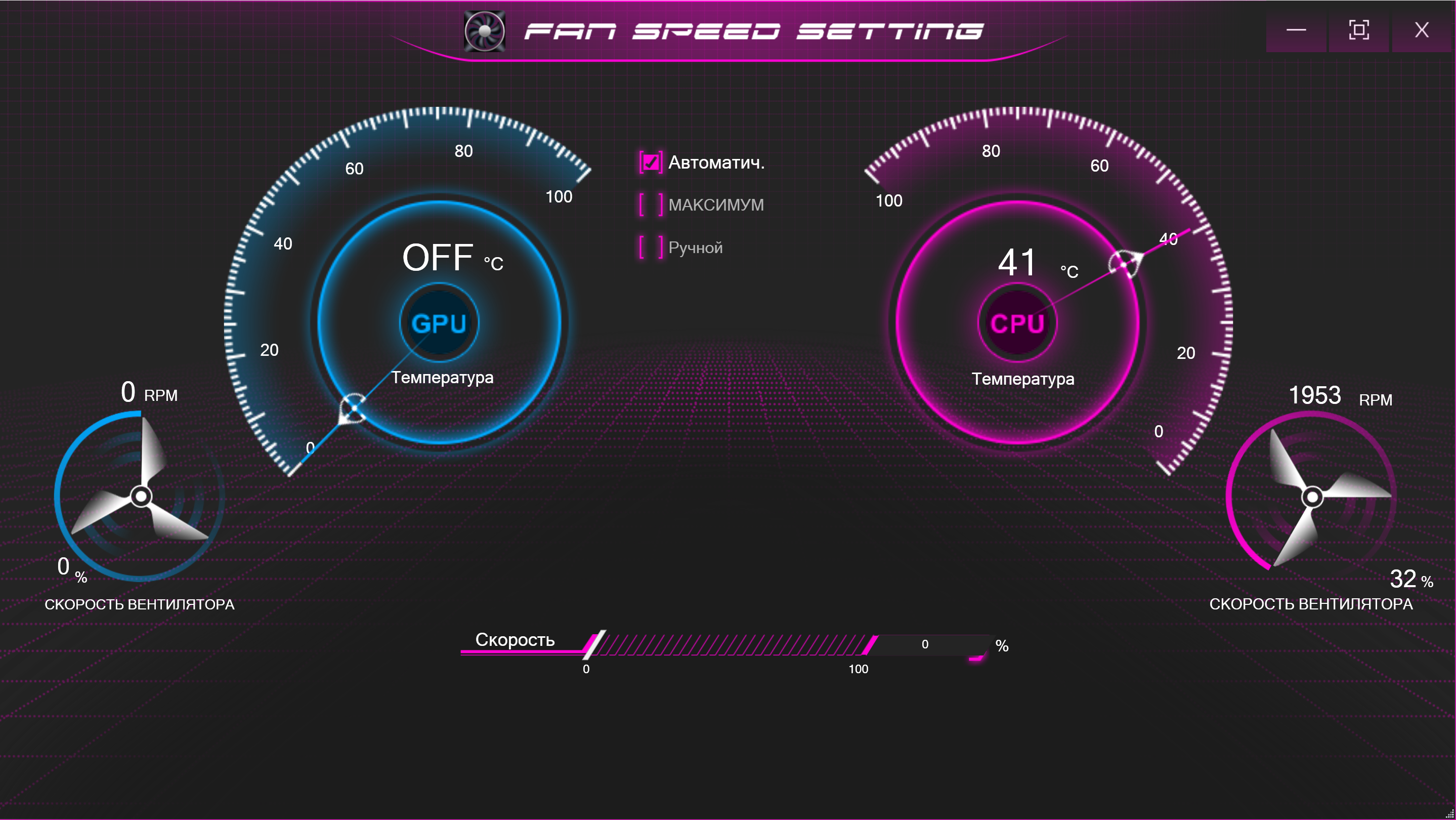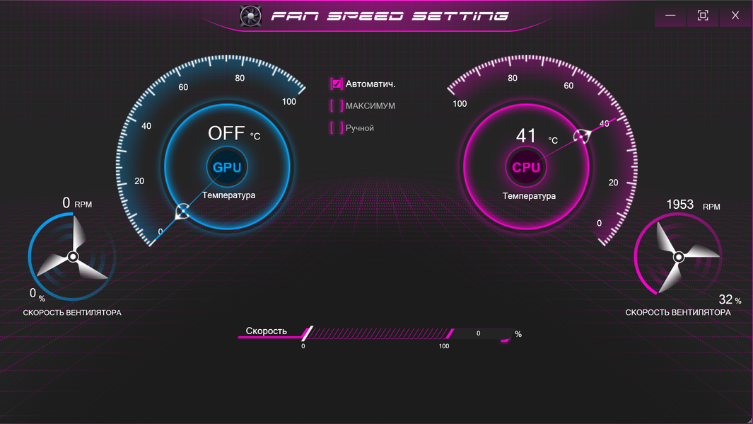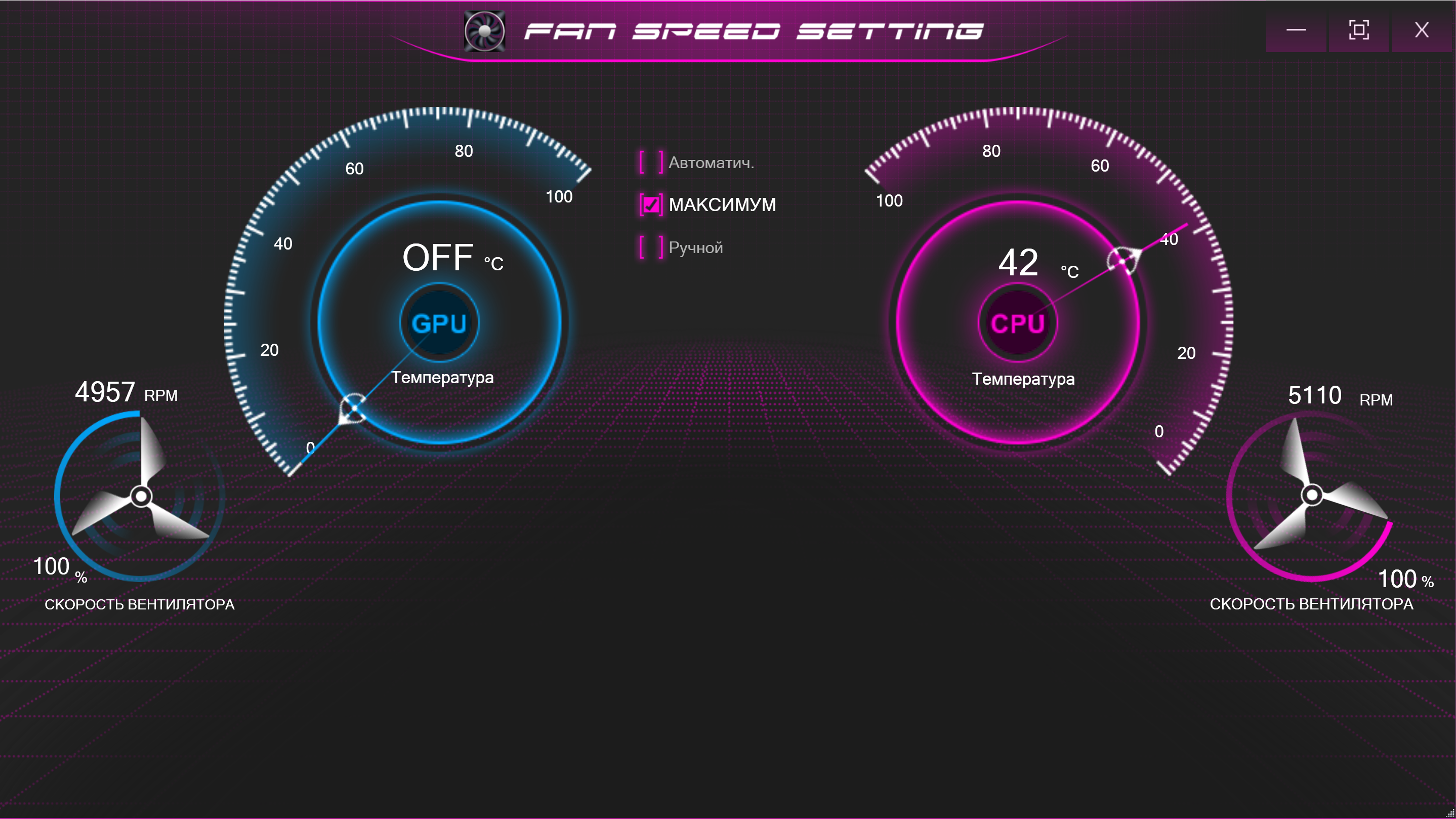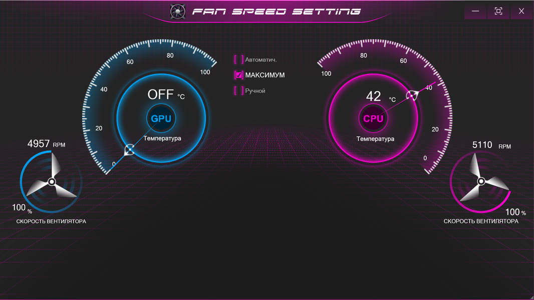 В режиме «максимум» вращение кулеров происходит на наибольших оборотах без каких-либо регулировок скорости.