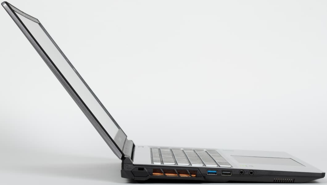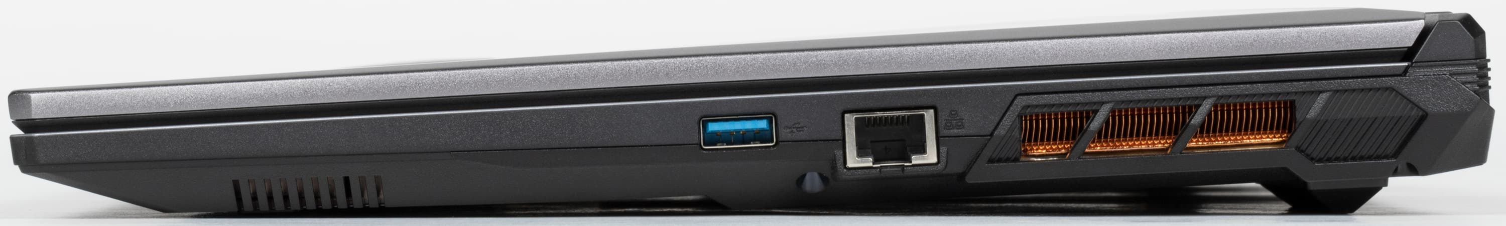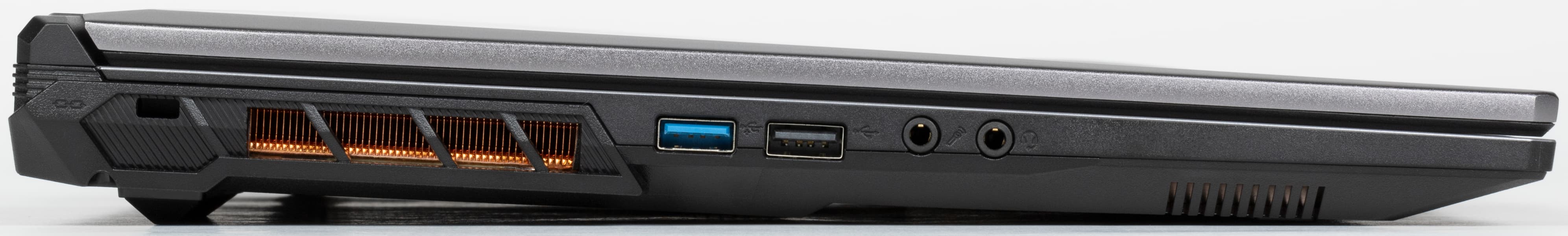 На левой боковой панели имеется отверстие кенсингтонского замка, решетка выходного отверстия системы охлаждения, порты USB3 Gen1 Type-A и USB 2.0, разъемы для подключения внешнего микрофона и наушников.