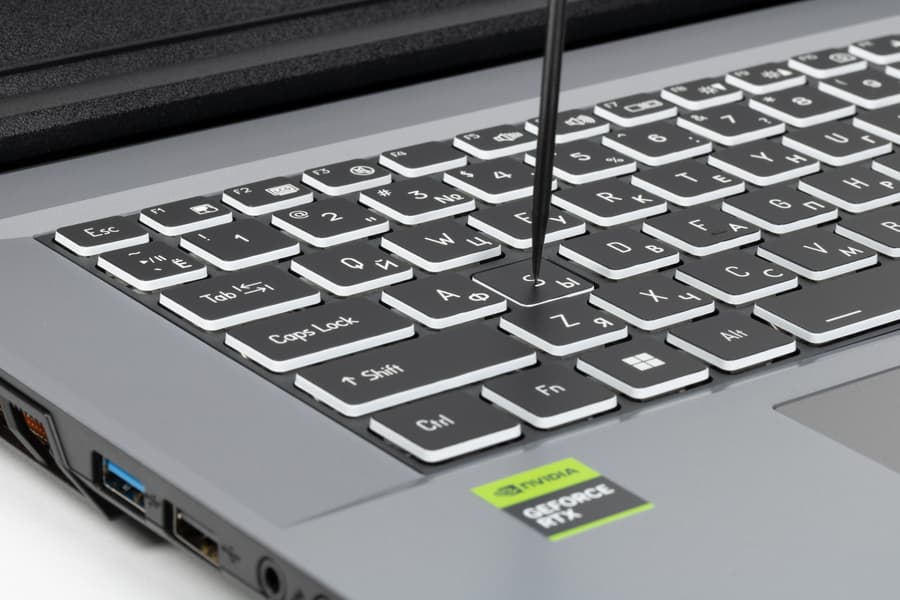 Клавиша включения питания располагается под экраном у правой петли крышки. Она оснащена собственным светодиодным индикатором, отличается от других кнопок по размерам и форме, поэтому ее нельзя перепутать с другими и нажать по ошибке.