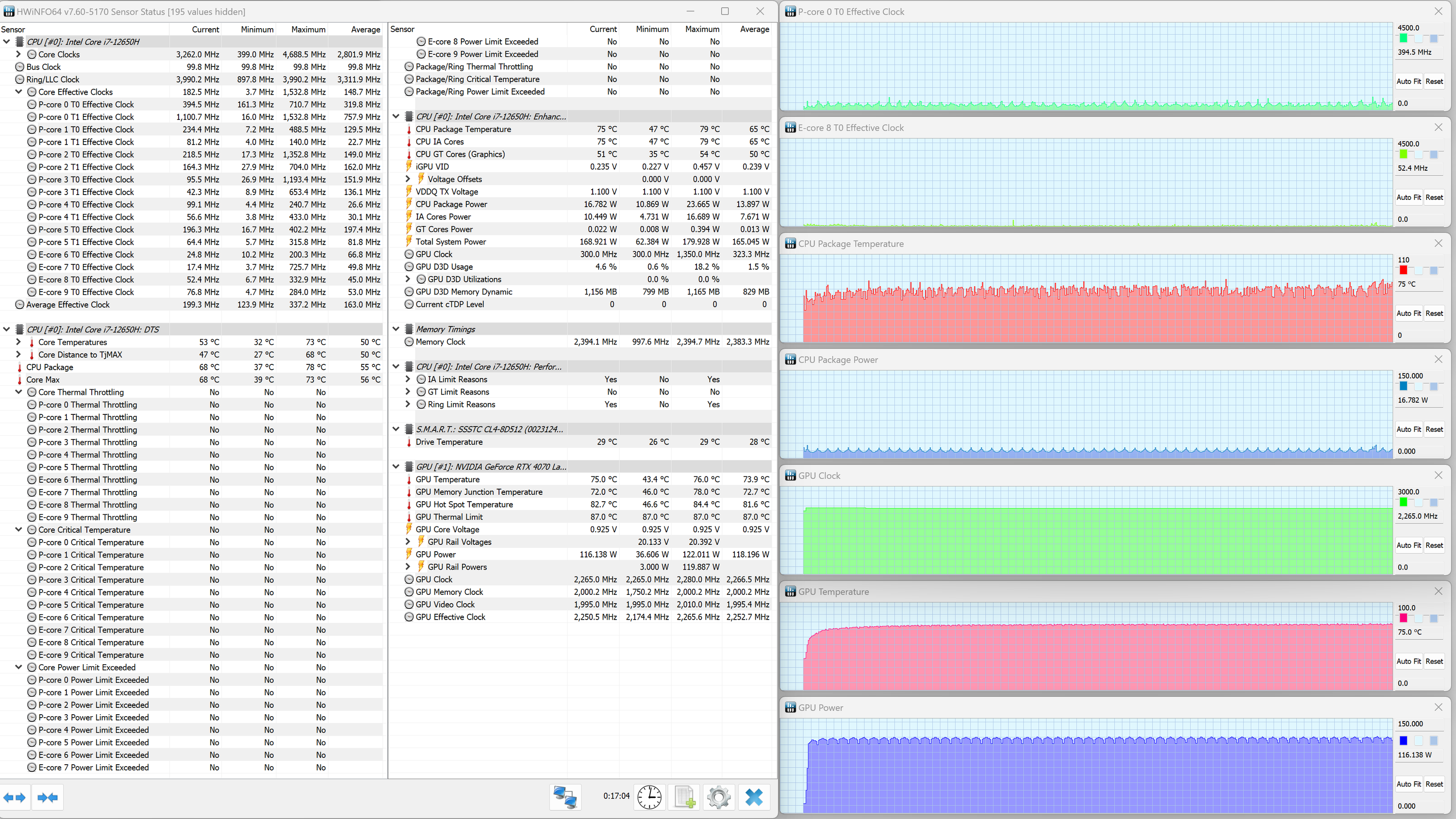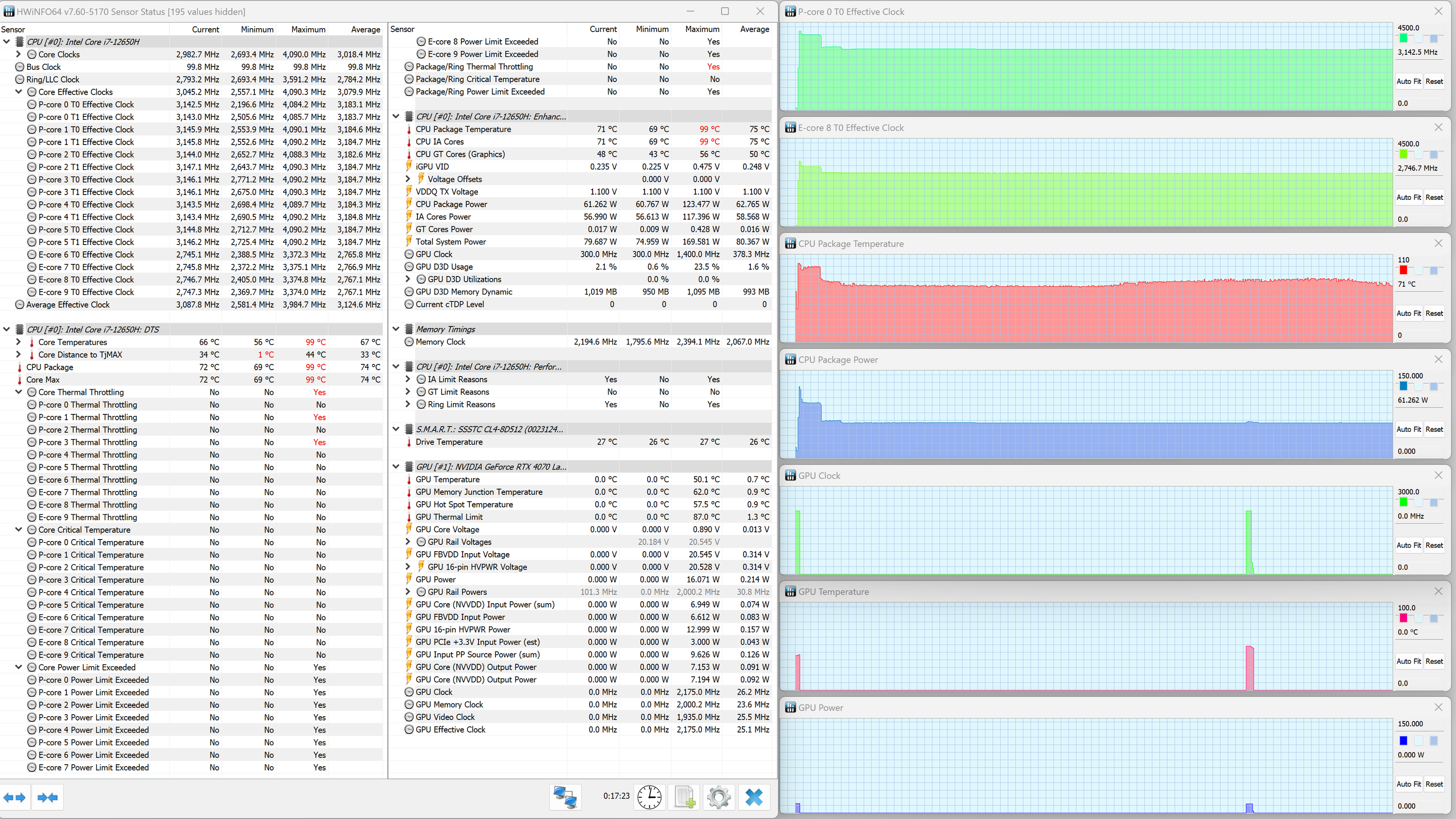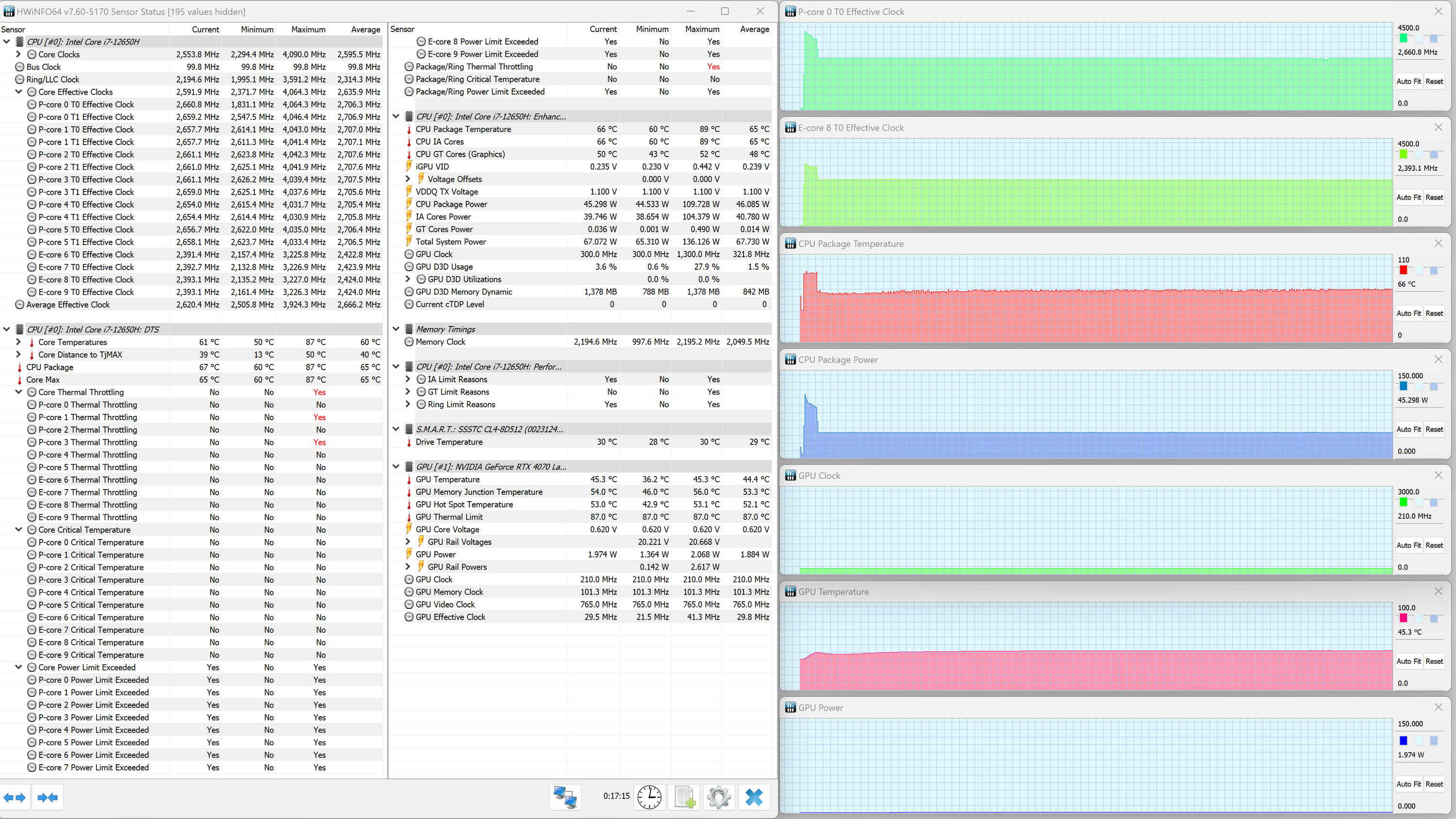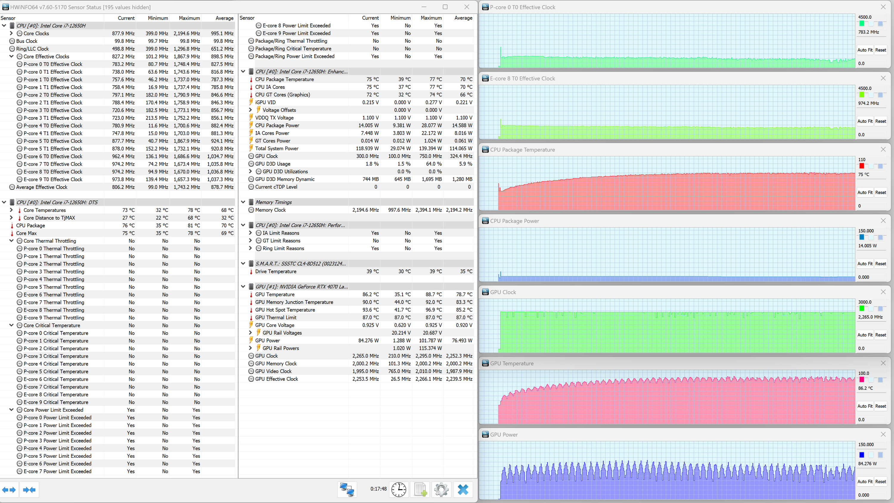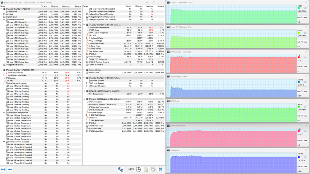 Thunderobot 911 Plus G2 Max оснащен мобильным процессором Intel Core i7-12650H не самого высокого уровня производительности. В нем имеются шесть высокопроизводительных, или P-ядер (Performance cores), работающих в два потока (до 4,7 ГГц в турборежиме), и четыре энергоэффективных, или E-ядра (Efficient cores), работающих в однопоточном режиме (до 3,4 ГГц в турборежиме). Отбор мощности в соответствии со штатным теплопакетом должен составлять 35—45 Вт при стабильной работе и до 115 Вт при Turbo Boost. Однако в тестировании под нагрузкой мы выявили, что в высокопроизводительных сценариях потребление CPU составляет при разгоне 123 Вт, а в стабильном режиме — 63 Вт. Низкоуровневые параметры главного вычислителя доступны в приложении HWinfo.