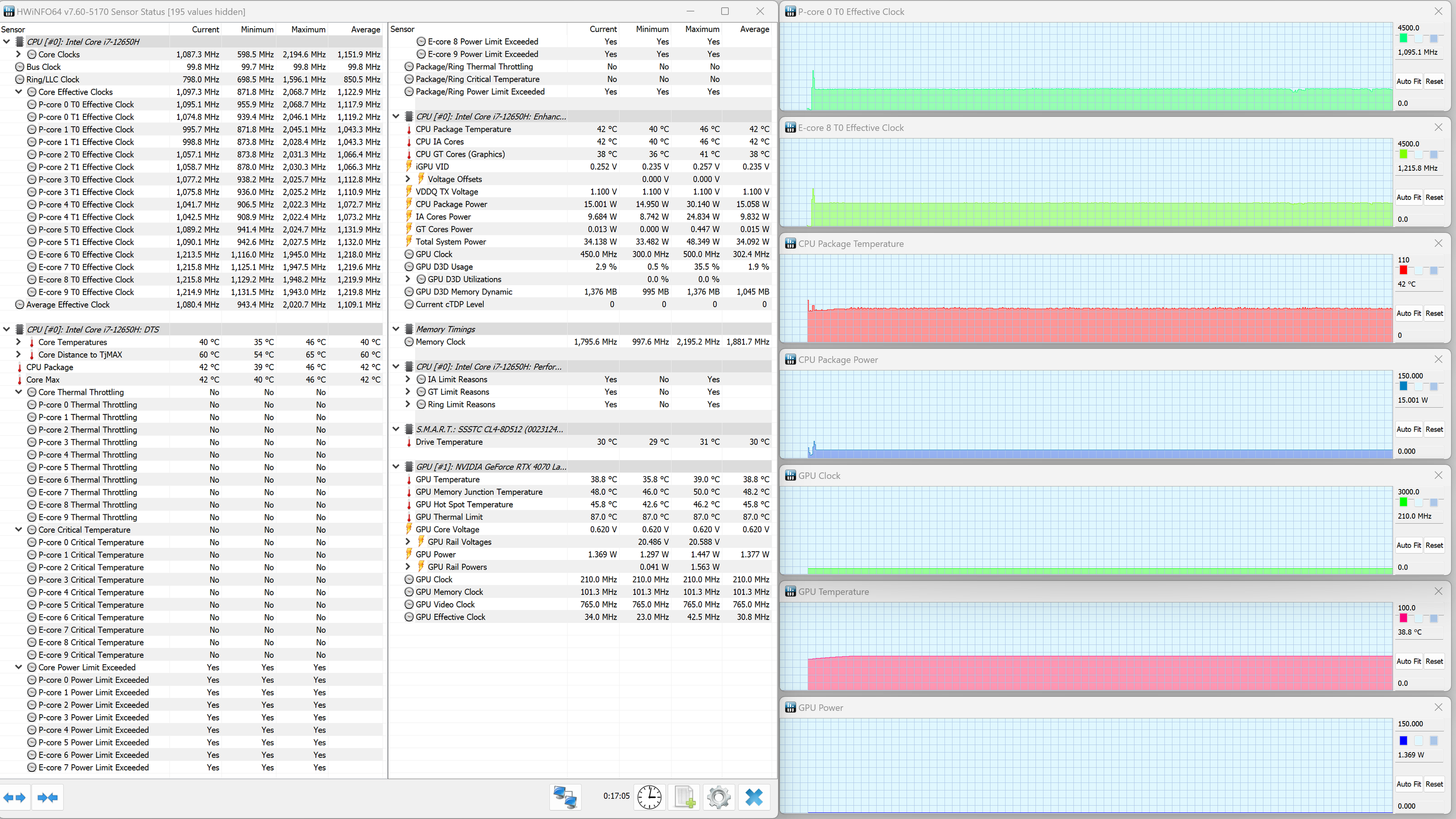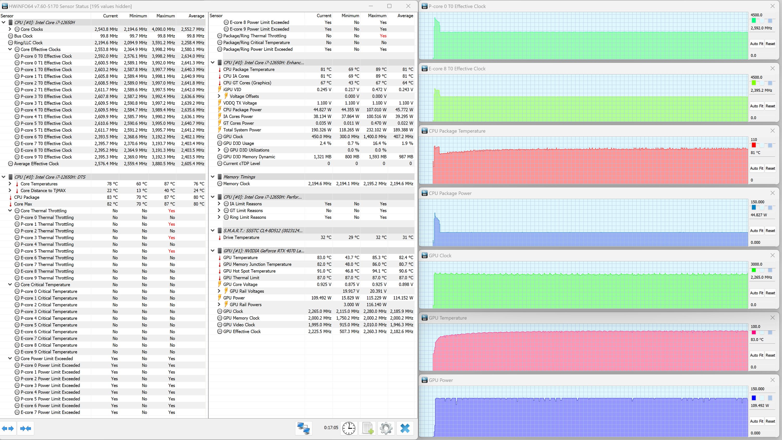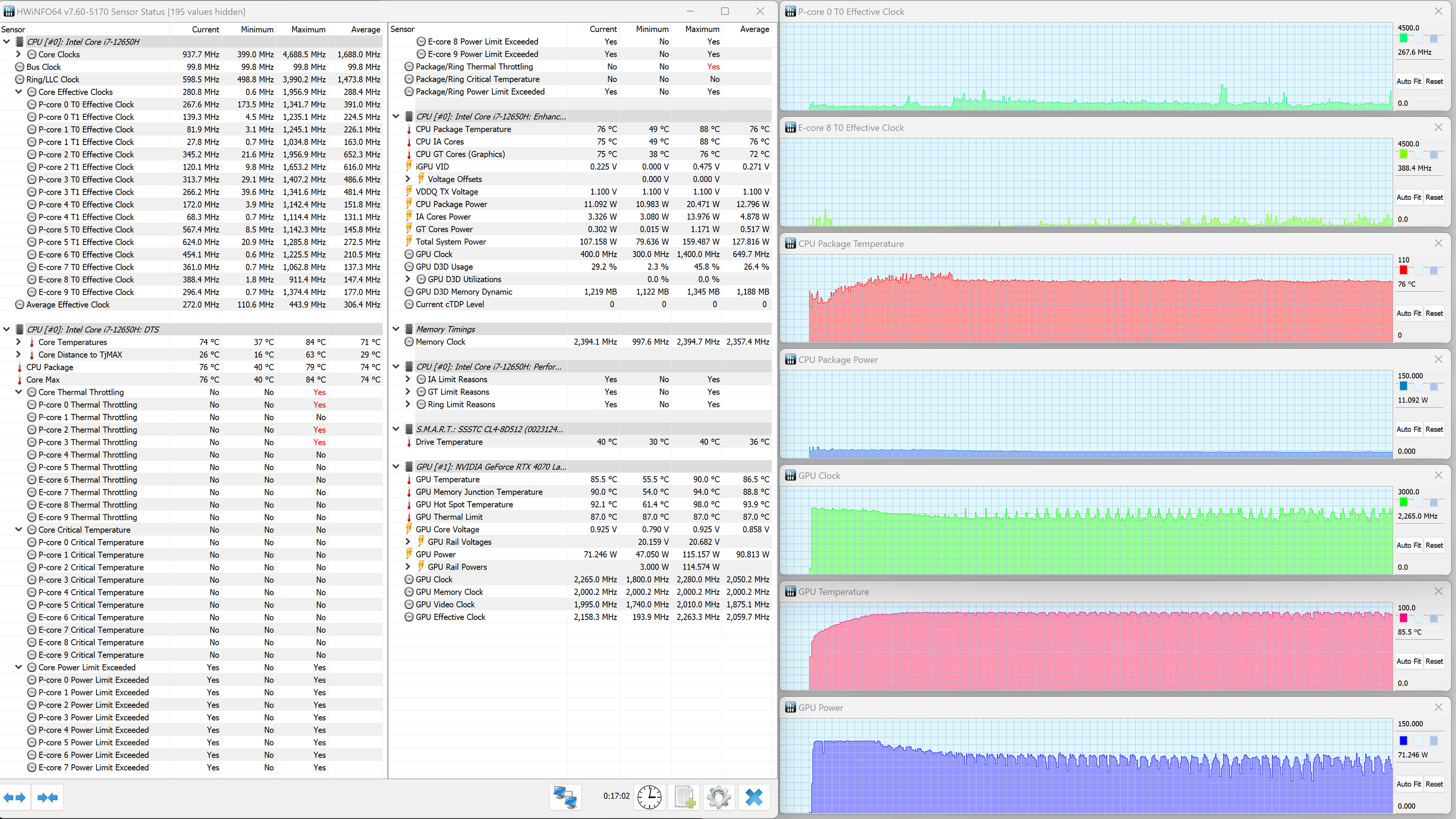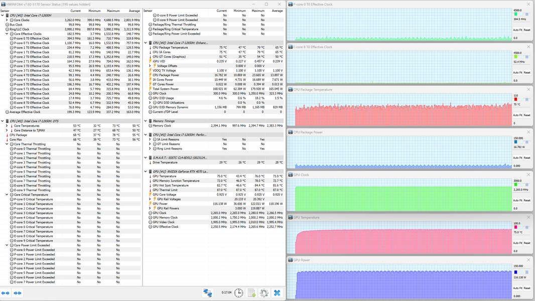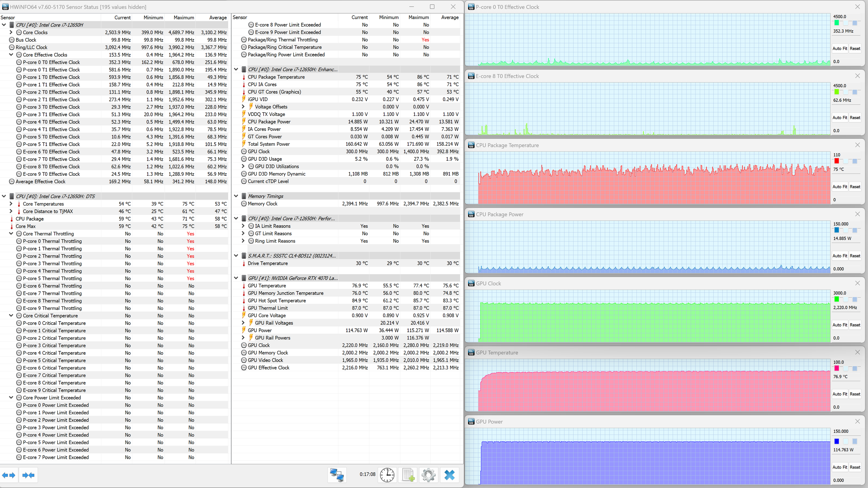 Thunderobot 911 Plus G2 Max оснащен мобильным процессором Intel Core i7-12650H не самого высокого уровня производительности. В нем имеются шесть высокопроизводительных, или P-ядер (Performance cores), работающих в два потока (до 4,7 ГГц в турборежиме), и четыре энергоэффективных, или E-ядра (Efficient cores), работающих в однопоточном режиме (до 3,4 ГГц в турборежиме). Отбор мощности в соответствии со штатным теплопакетом должен составлять 35—45 Вт при стабильной работе и до 115 Вт при Turbo Boost. Однако в тестировании под нагрузкой мы выявили, что в высокопроизводительных сценариях потребление CPU составляет при разгоне 123 Вт, а в стабильном режиме — 63 Вт. Низкоуровневые параметры главного вычислителя доступны в приложении HWinfo.
