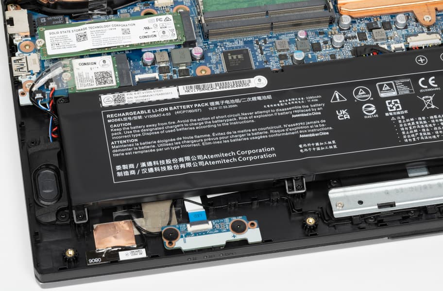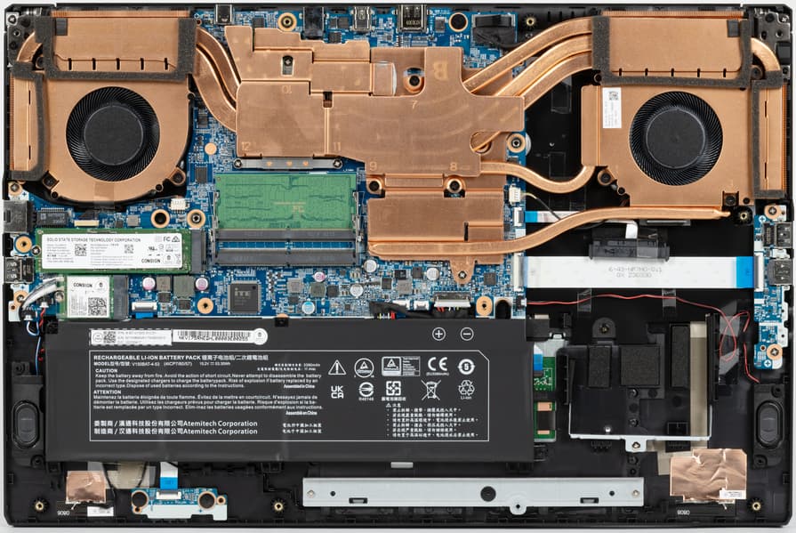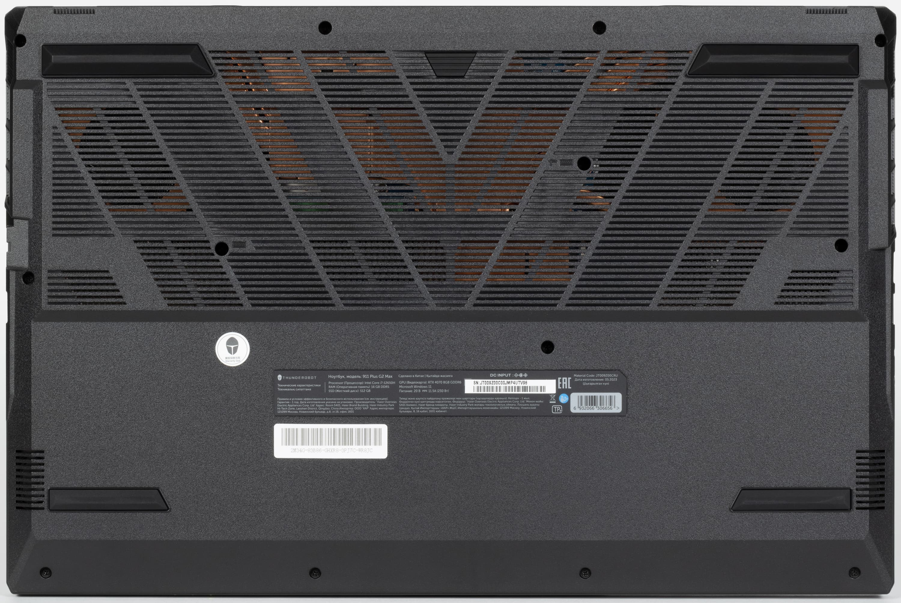 Входные щели воздухозаборников располагаются под всей основной электроникой и компонентами системы охлаждения. Днище крепится на четырнадцати винтах с традиционным крестовым шлицем, один из которых имеет пломбировку в виде заклейки стикером. Вывернув эти винты, мы получаем доступ к компонентам аппаратной оснастки Thunderobot 911 Plus G2 Max.