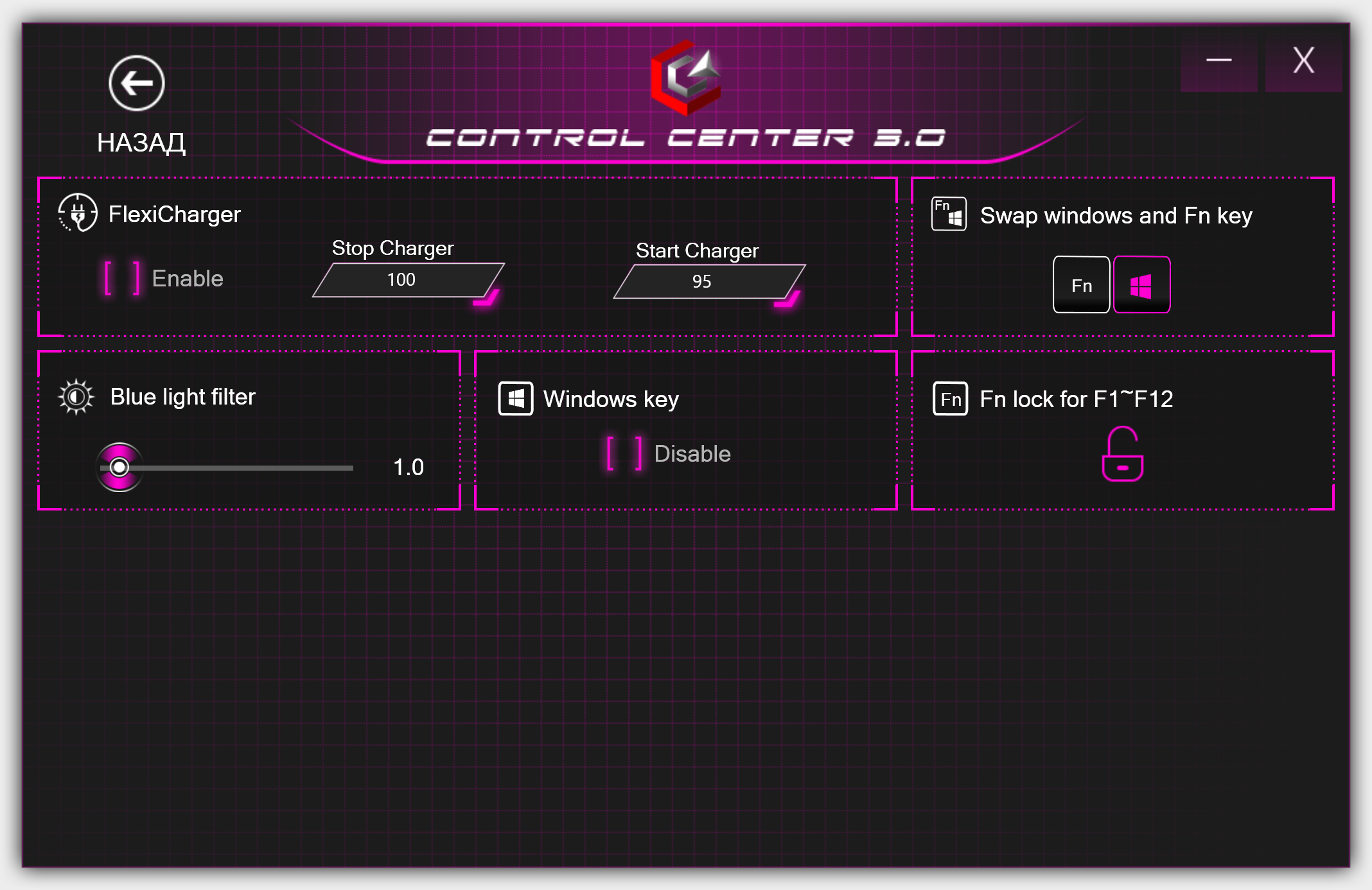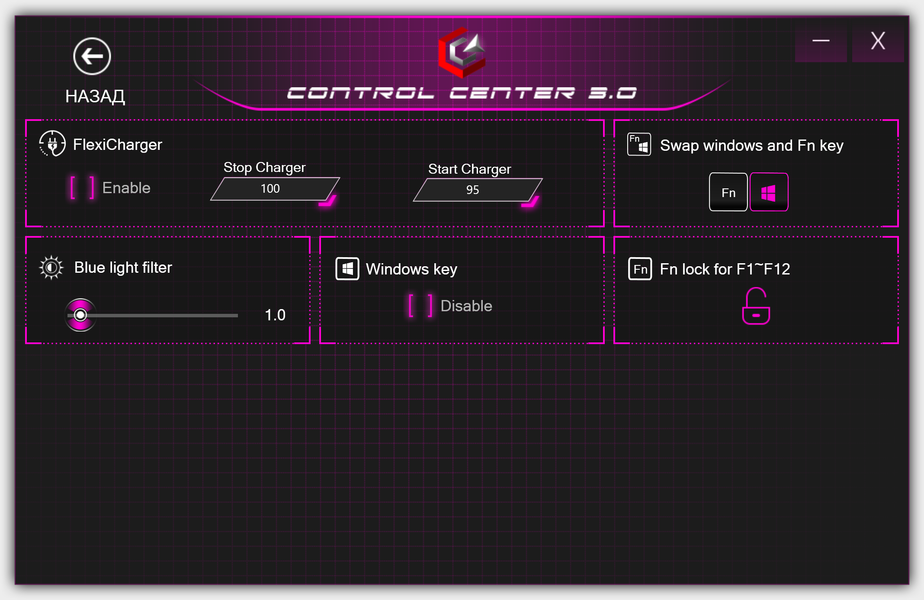 В разделе Preference можно поменять отсечки начала и окончания зарядки аккумулятора, изменить функциональное назначение некоторых кнопок клавиатуры и активировать фильтр синего света, чтобы понизить утомляемость глаз при работе с экраном. Кстати, об экране.