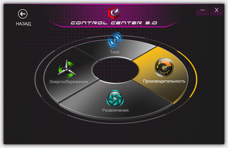 Доступны четыре сценария (пресета, профиля) мощности: «Производительность», «Развлечения», «Энергосбережение» и «Тихо». Их особенности можно определить по названиям, и мы рассмотрим их более подробно в разделе с тестированием ноутбука под максимальной нагрузкой.