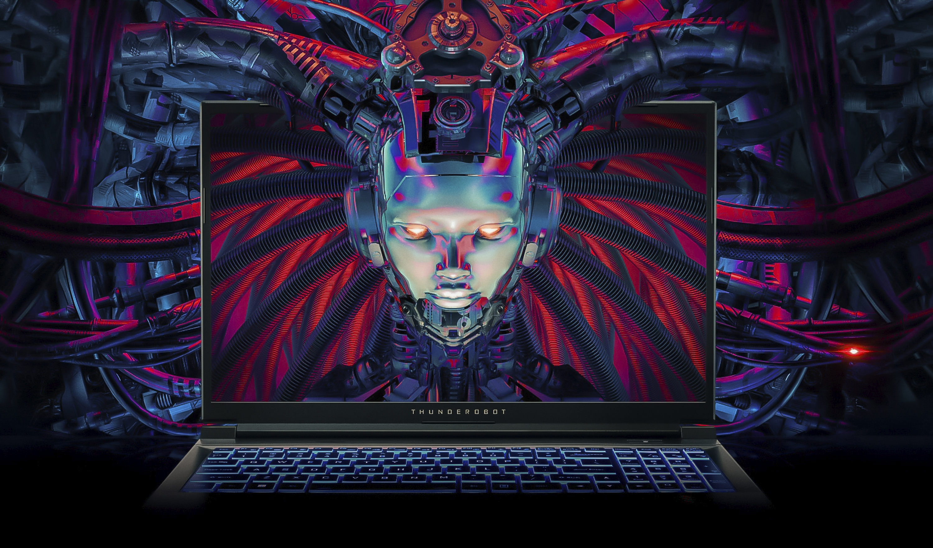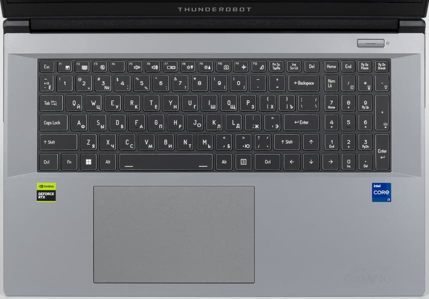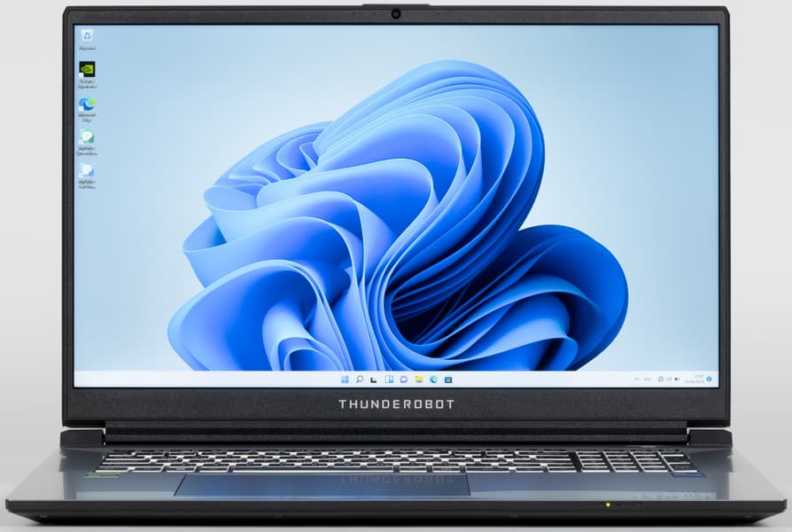 Снаружи на ней выделяется рельефный логотип серии игровых ноутбуков Thunderobot и четыре узких полоски. Эти элементы подсвечиваются синим при включении питания. Модель обладает крупным экраном 17,3 дюйма по диагонали, поэтому обладает значительными размерами и весит почти 2,8 кг.