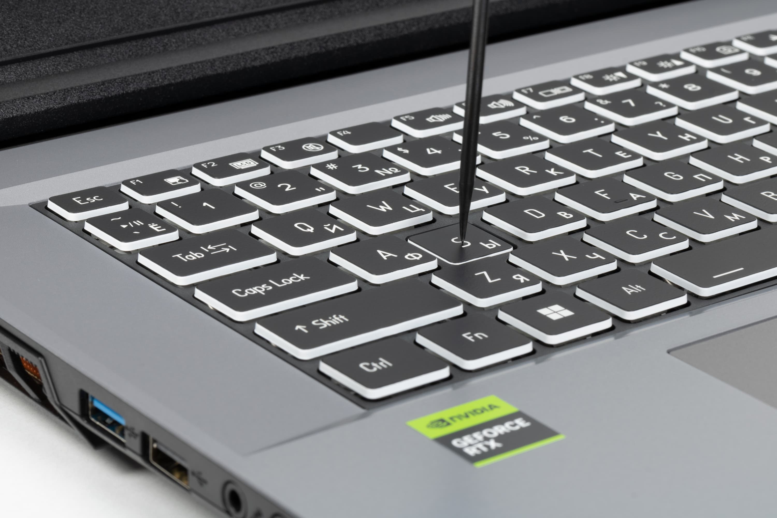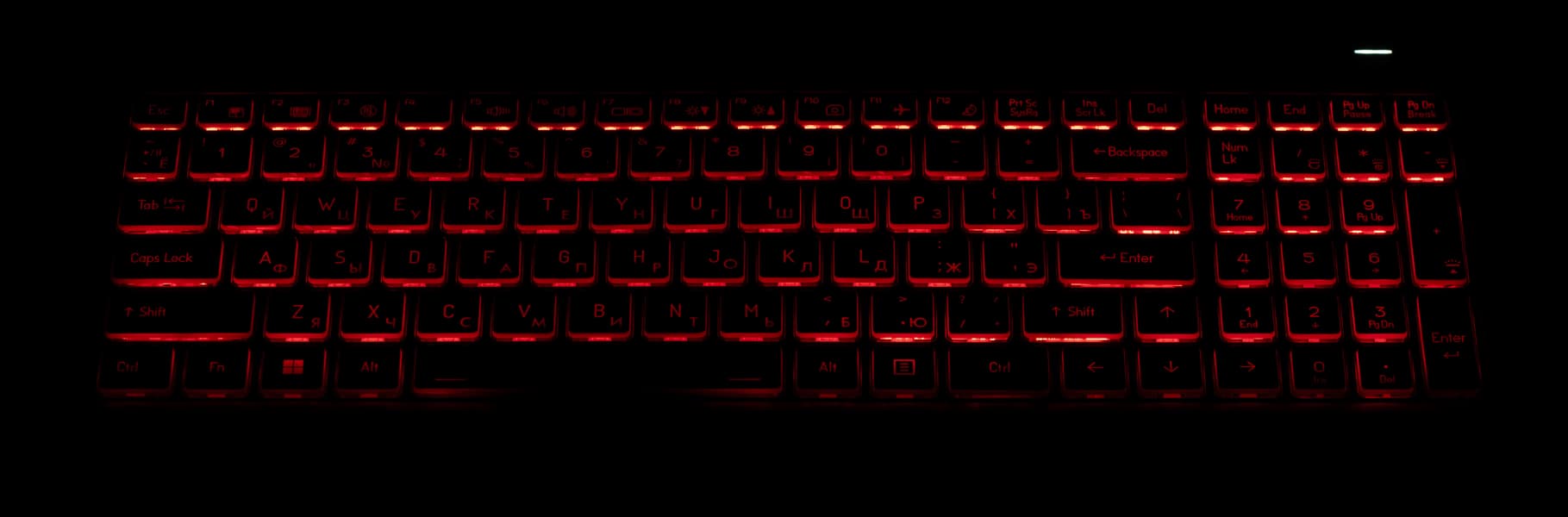 Подсвечиваются сами символы на клавишах и существенно сильнее — их контуры. Зона подсветки под каждой клавишей видна весьма назойливо, что несколько раздражает. Распределение света и специфика маркировки национальной клавиатуры ухудшают различимость символов.