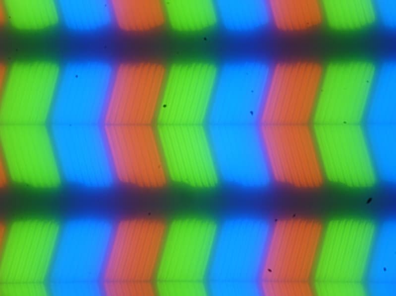 В этом ноутбуке используется матрица типа IPS. Микрофотографии демонстрируют типичную для IPS структуру субпикселей (черные точки — это пыль на матрице фотоаппарата):
