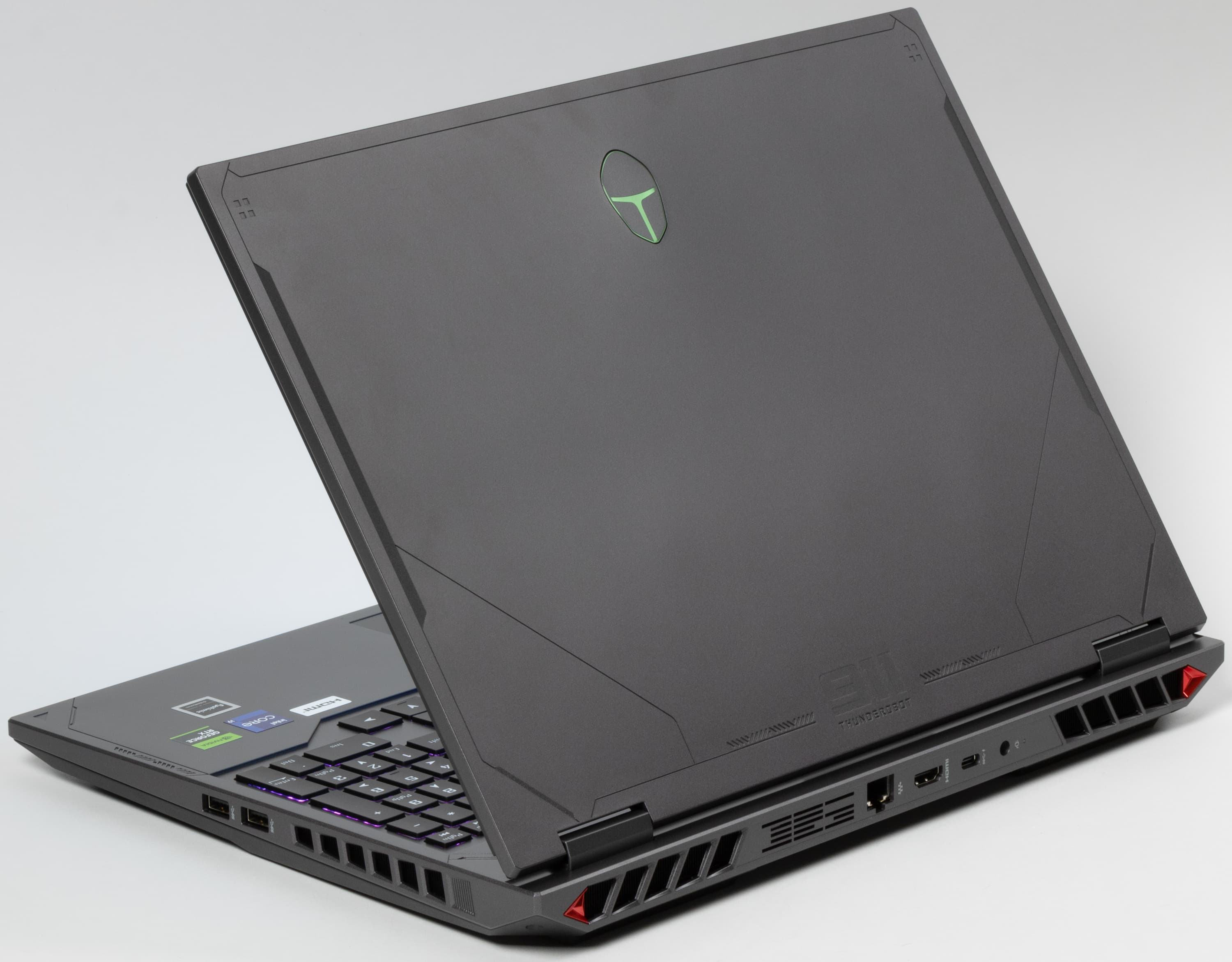 Оформление корпуса по меркам игровых ноутбуков скорее строгое: графитово-серый цвет поверхностей и минимум декоративных элементов, в числе которых ненавязчивый рельефный узор, подсвечиваемый щиток логотипа на верхней крышке и две малинового цвета треугольные вставки на заднем торце.