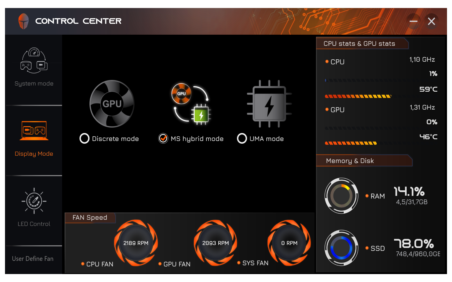 В утилите Control Center (в данном случае ее издатель Leishen, если верить названию папки, в которую она устанавливается, в ней самой чего-либо вроде «About» мы не нашли) реализованы минимальные функции мониторинга, включая отображение скоростей вращения вентиляторов (в других утилитах вроде AIDA64 их посмотреть нельзя), а также выбор одного из трех профилей производительности: «Office mode/Режим Офис», «Gaming/Игра» или «High Performance/Высокая производительность».