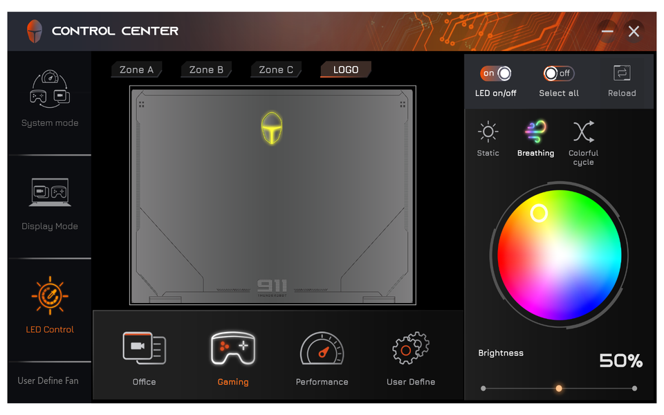 Еще одна функция утилиты — управление RGB-подсветкой раздельно для трех зон клавиатуры и логотипа на наружной части крышки с экраном. Можно выбирать цвета, яркость и эффекты.