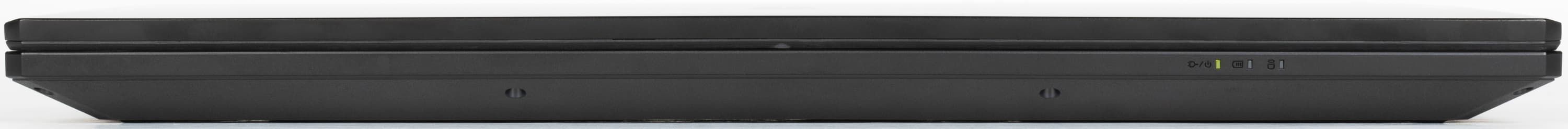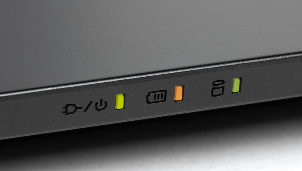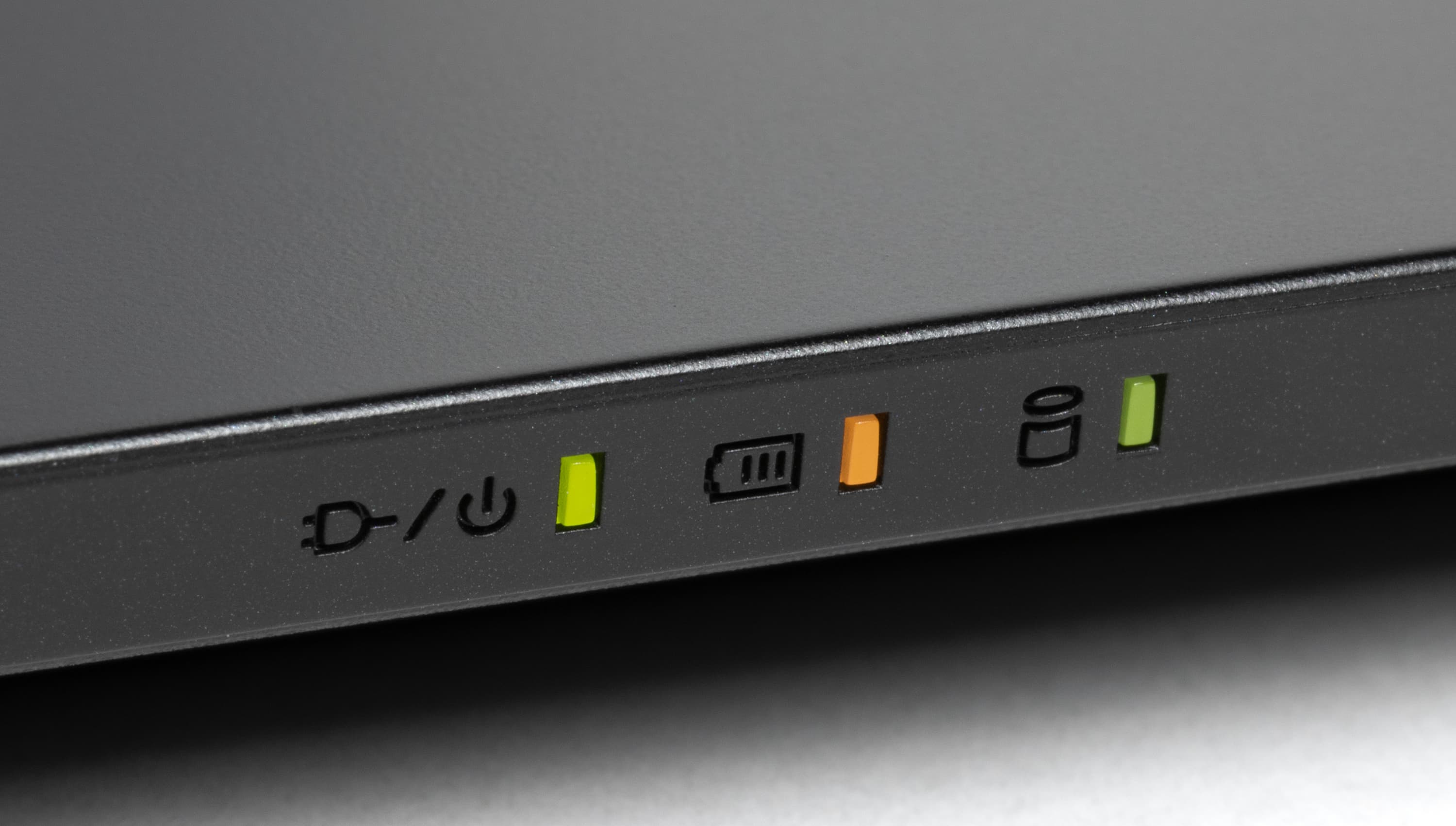 Еще три индикатора находятся на передней кромке корпуса. Левый горит желтым при подключении блока питания, становится зеленым после включения ноутбука кнопкой и мигает в режиме сна, средний отображает состояние батареи (об этом ниже), правый показывает дисковую активность.