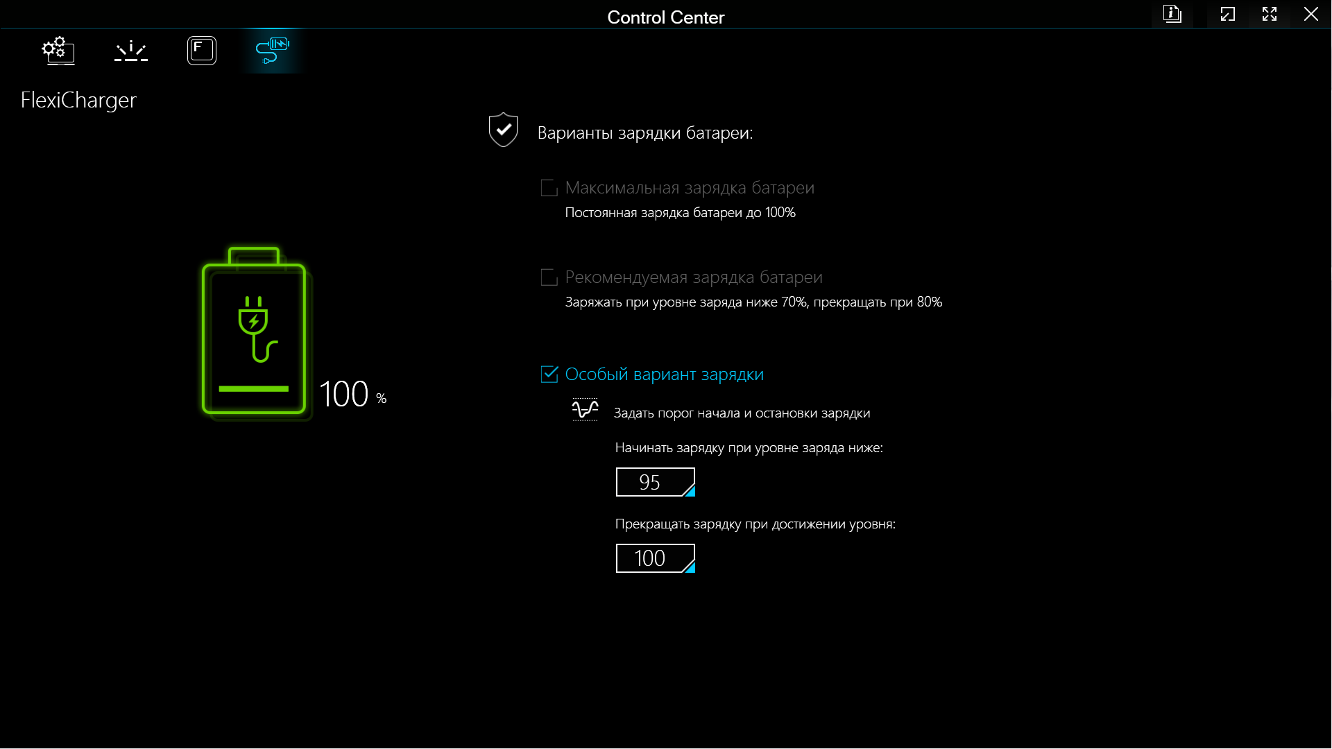 Наконец, четвертая кнопка в левом верхнем меню «FlexiCharger» открывает выбор вариантов зарядки батареи — максимальную (до 100%), рекомендуемую (заряд начнется лишь если остаток энергии меньше 70% и прекратится по достижении 80%), а также с задаваемыми вручную порогами (нижний от 40 до 95 процентов, верхний от 60 до 100 процентов):