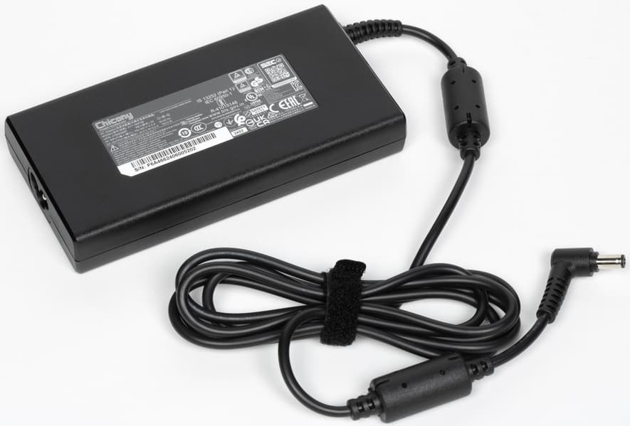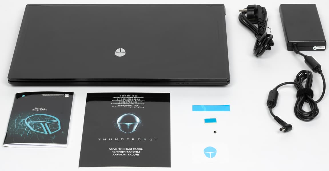В комплекте, кроме самого ноутбука, идет блок питания со сменным входным кабелем и распаянным выходным (1,8 м, есть фиксатор-«липучка»), винт для крепления дополнительного накопителя и две термопрокладки (мелочь, а приятно), наклейка-логотип, а также печатные материалы, в том числе на русском языке.