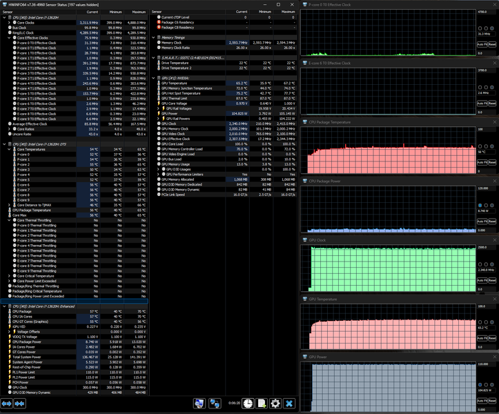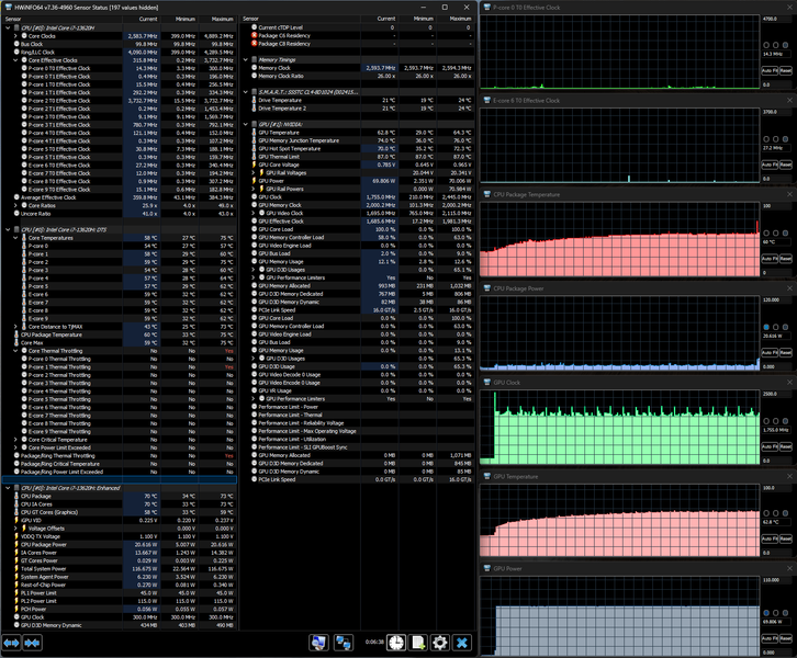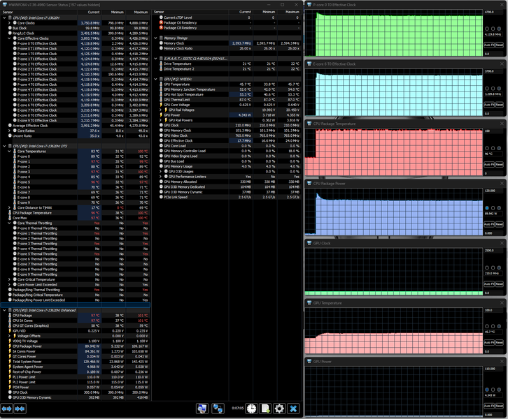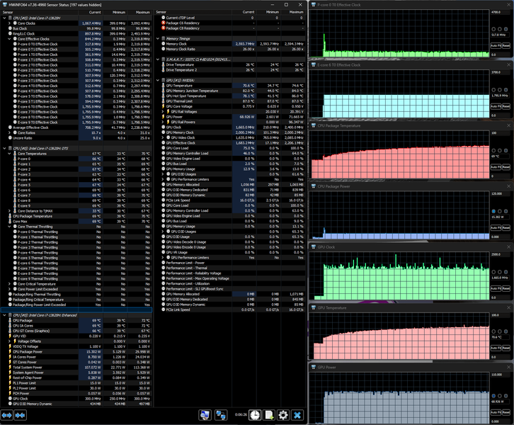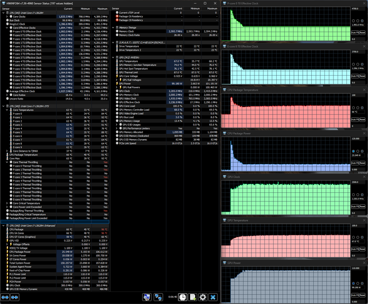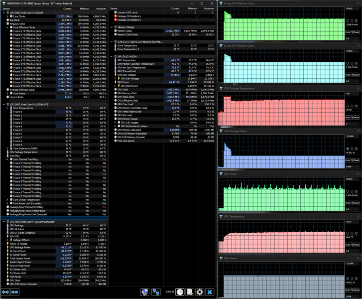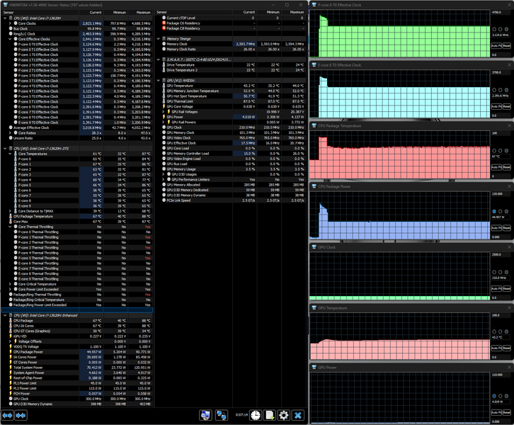 Напомним: используемая в данной модели дискретная видеокарта относится к серии Nvidia GeForce RTX 40 в версии для ноутбуков (архитектура Ada Lovelace), для GeForce RTX 4060 ее производитель заявляет наличие 3072 ядер, 128-разрядную шину памяти с подключением 8 ГБ ОЗУ GDDR6, тактовую частоту (с ускорением) 1470—2370 МГц и потребление 35—115 Вт. В официальных параметрах ноутбука, приведенных в инструкции, заявлено немного иное: частота до 2295—2370 МГц, потребление до 105 Вт, но в тестах мы видели и 110 Вт, причем долговременно, а частота на короткое время могла достигать 2,45 ГГц.