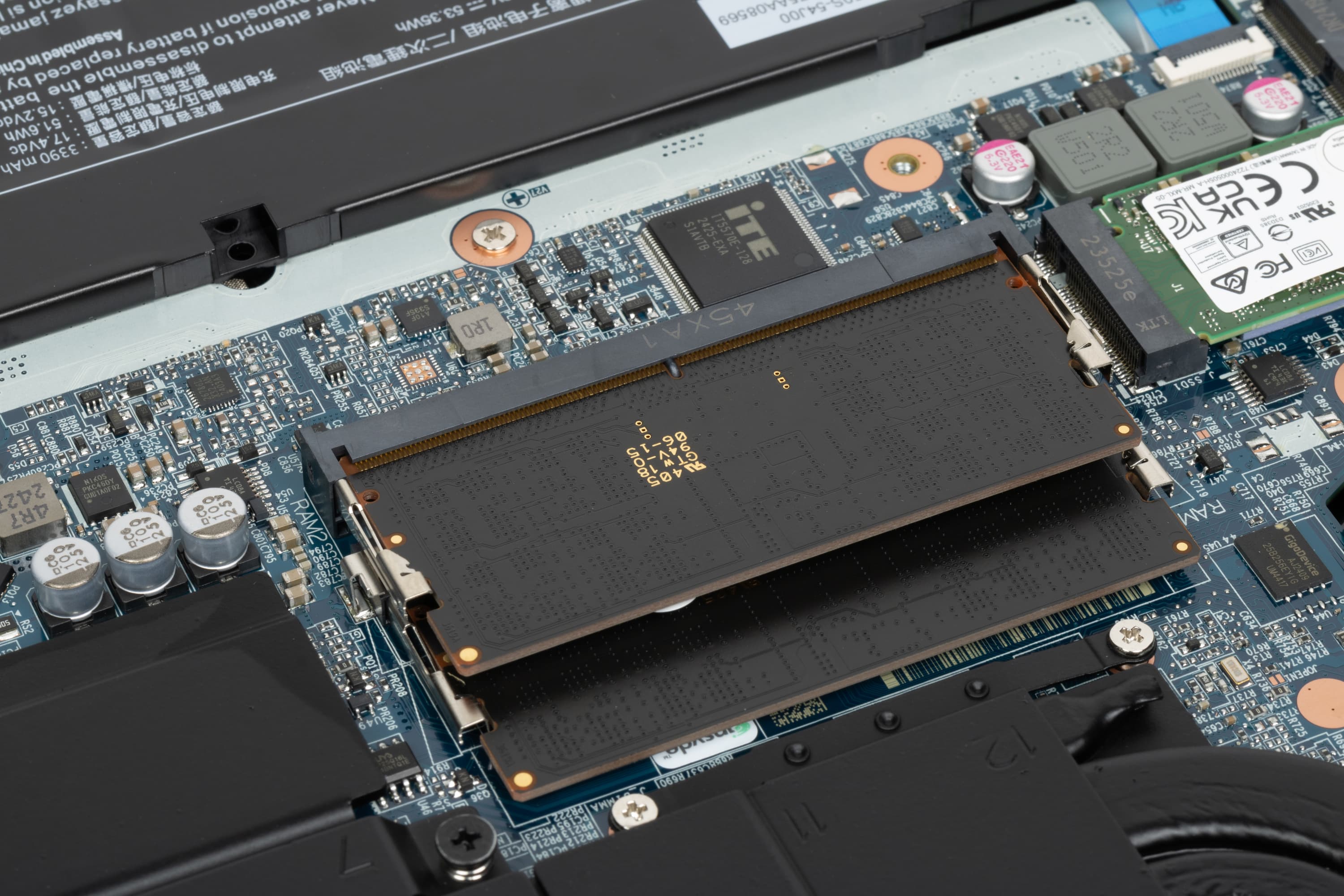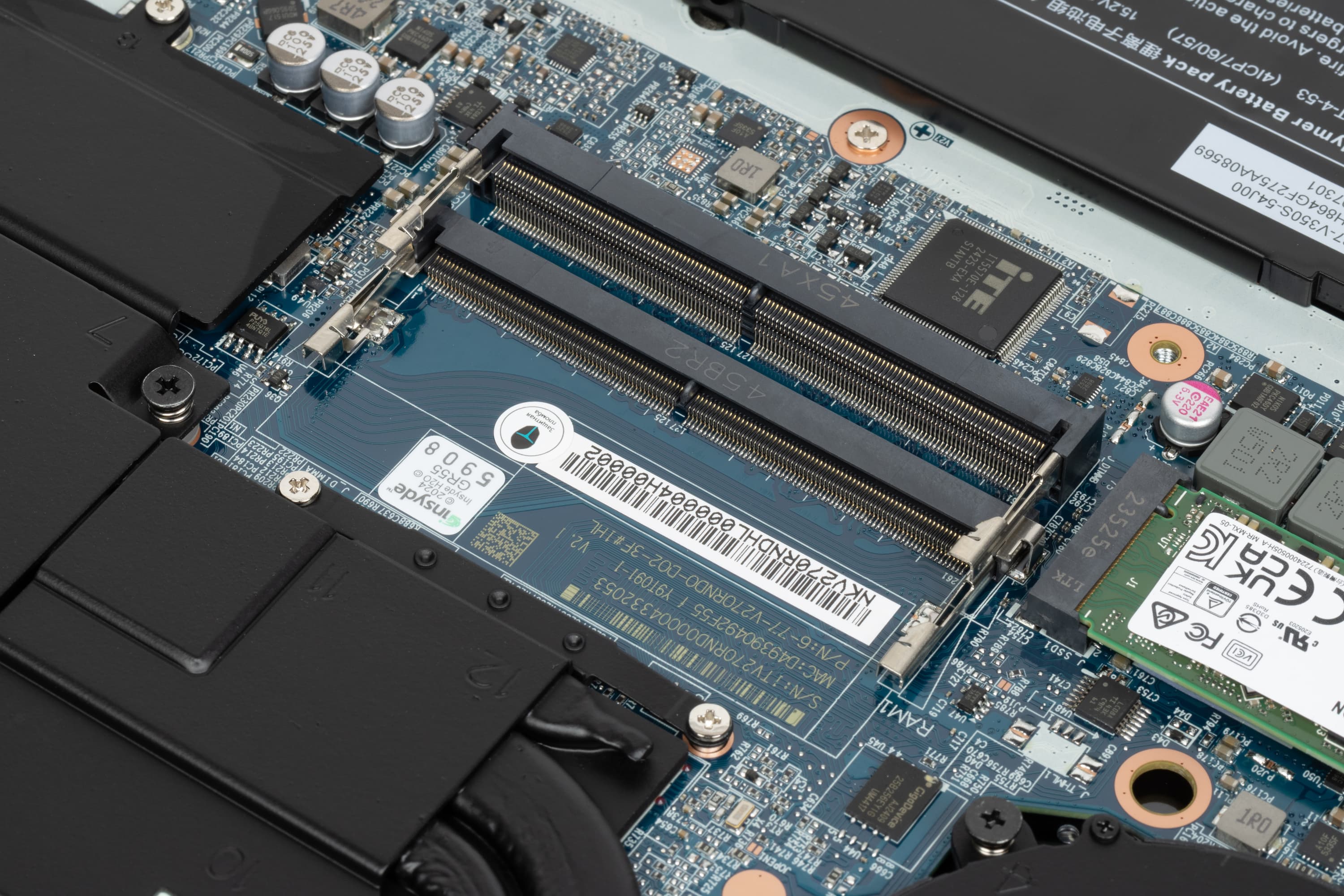 На плате хорошо заметны и легко доступны слоты под модули SO-DIMM (оба заняты), накопитель в слоте М.2 (на предыдущем фото он слева) и свободный слот для второго подобного SSD (справа).