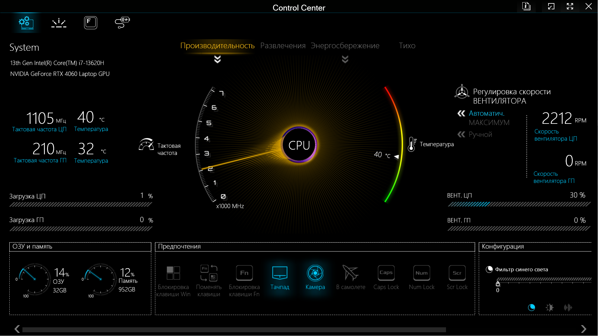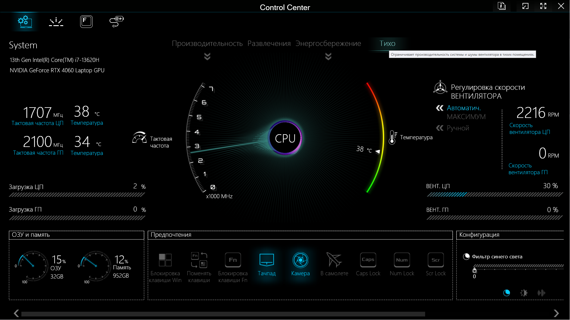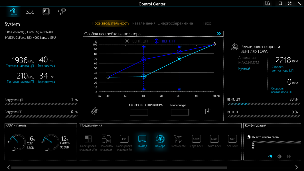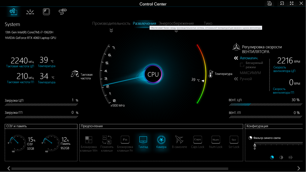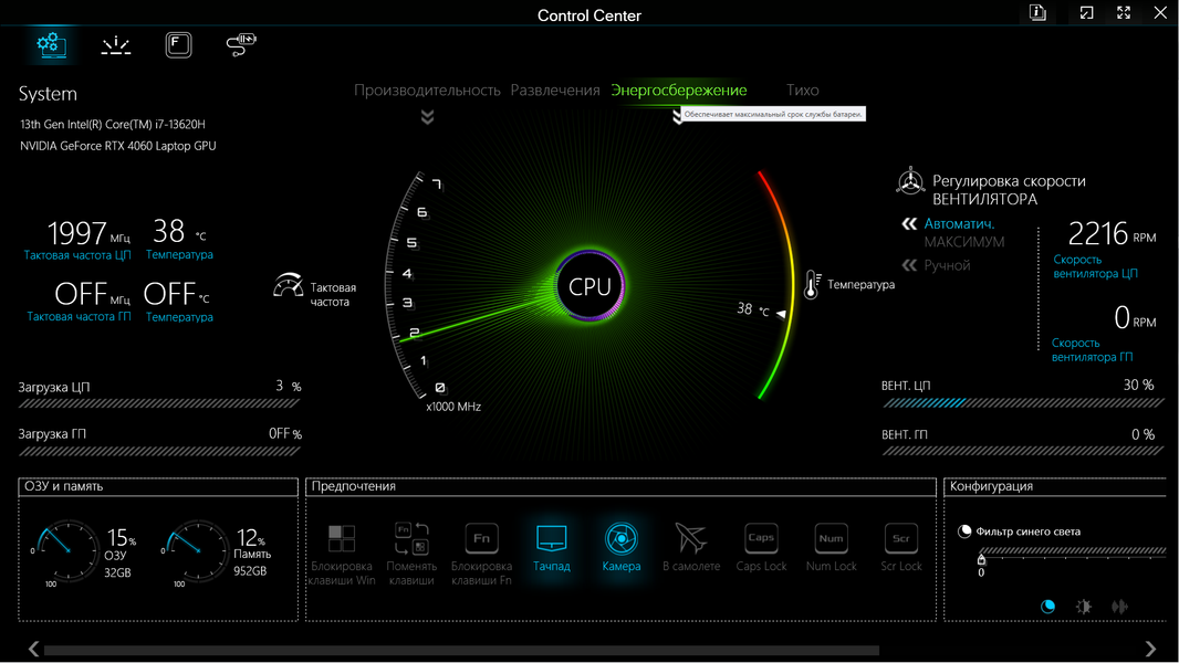 В нижней части окна есть «Предпочтения» — ряд кнопок, позволяющих, например, отключить тачпад или камеру, включить Caps Lock или заблокировать клавишу Fn. А «Конфигурация» (внизу справа) позволит задействовать и отрегулировать фильтр синего цвета (использование более теплых цветов для снижения нагрузки на глаза в ночное время), изменить яркость экрана и громкость звуковоспроизведения.
