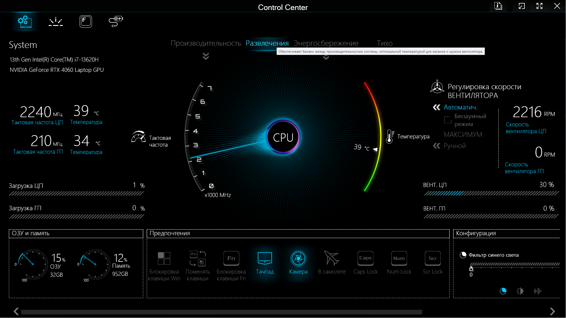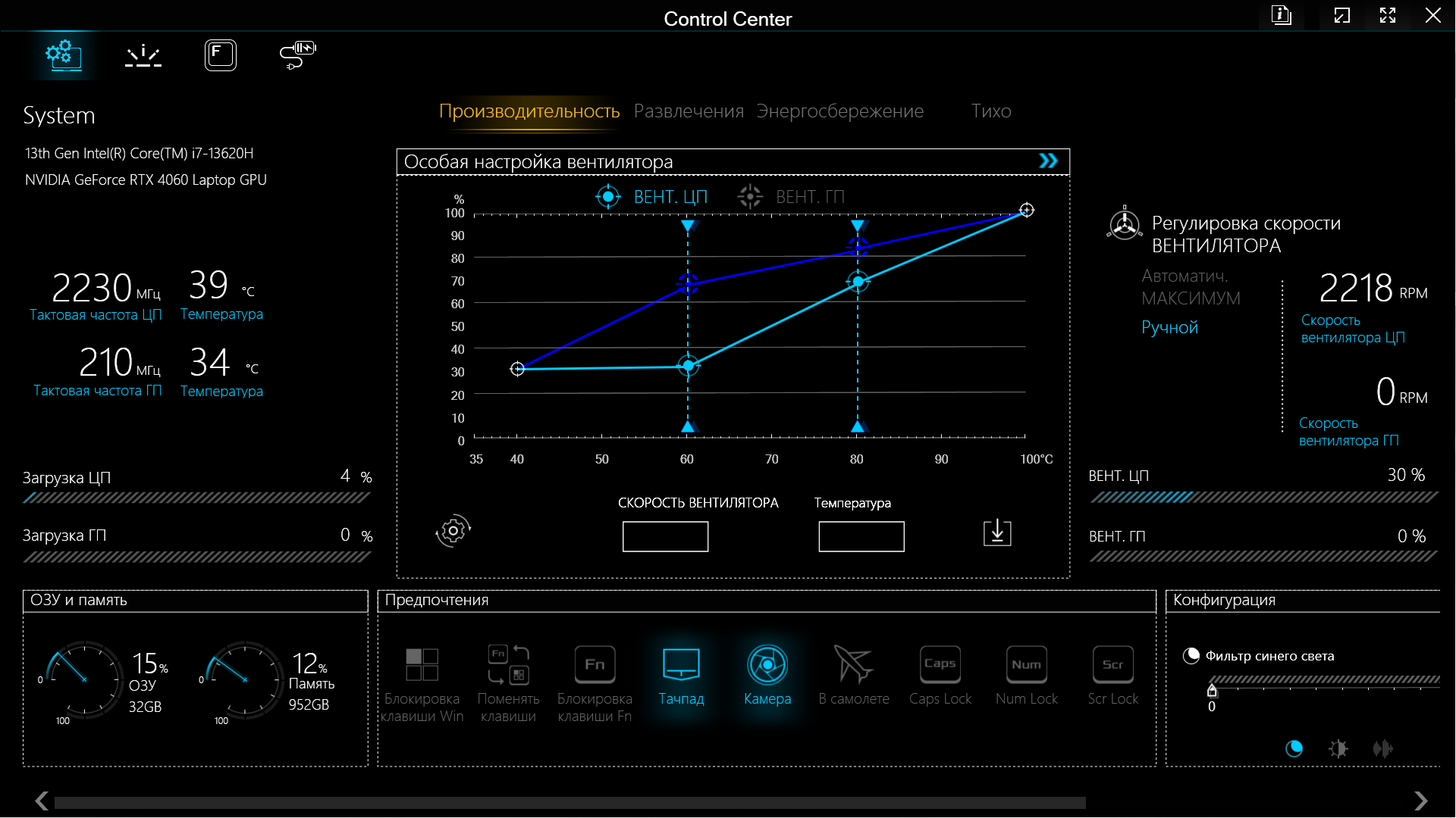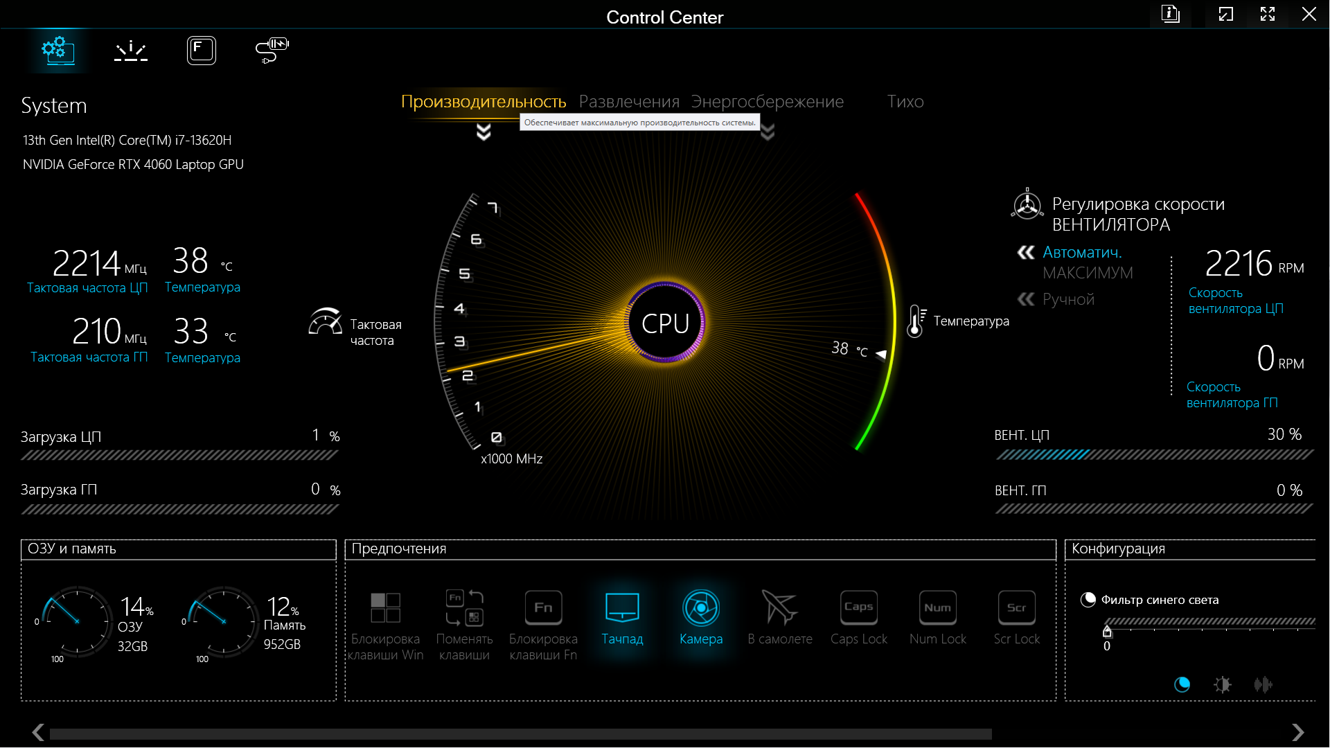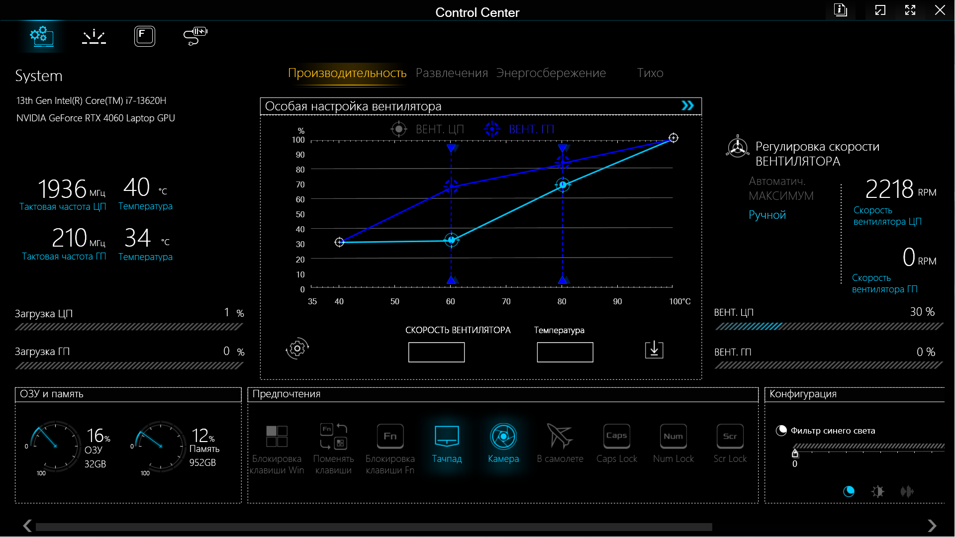 В нижней части окна есть «Предпочтения» — ряд кнопок, позволяющих, например, отключить тачпад или камеру, включить Caps Lock или заблокировать клавишу Fn. А «Конфигурация» (внизу справа) позволит задействовать и отрегулировать фильтр синего цвета (использование более теплых цветов для снижения нагрузки на глаза в ночное время), изменить яркость экрана и громкость звуковоспроизведения.