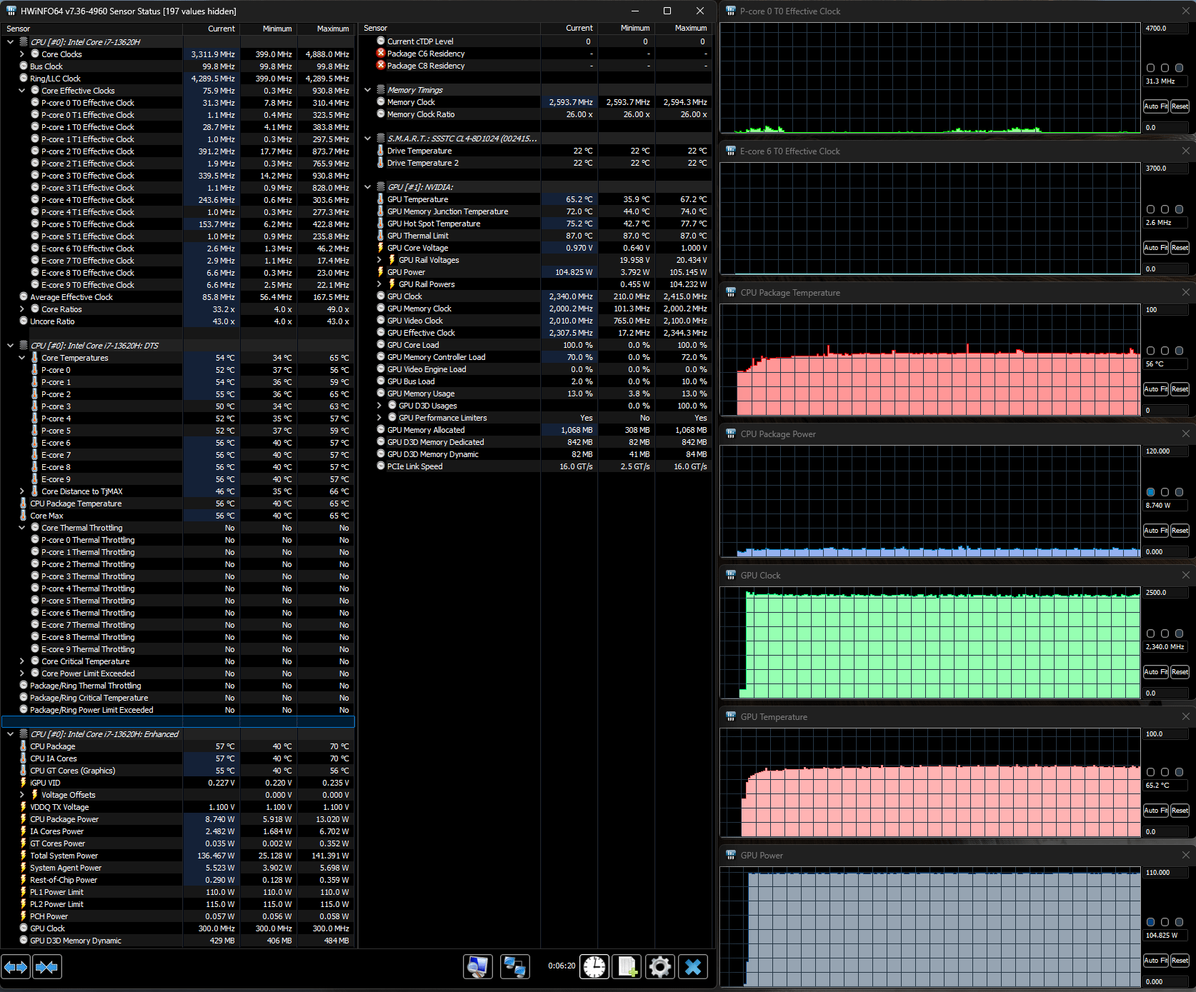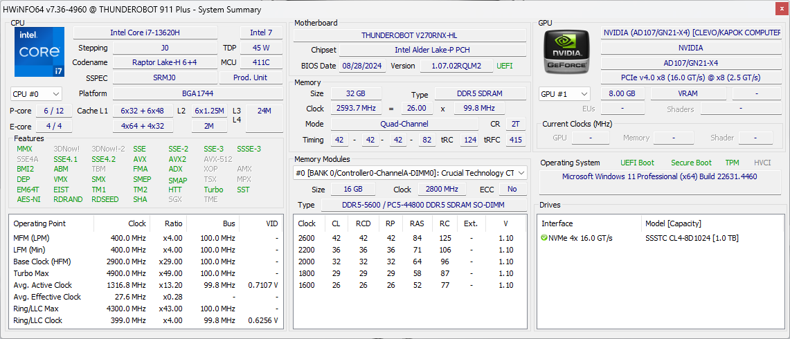 - Thunderobot Gravity 15 Pro с Intel Core i7-13650HX (6+8 ядер/20 потоков, до 2,6/4,9 ГГц, 45—55/157 Вт), Nvidia GeForce RTX 4060 Laptop, 32 ГБ DDR5-5600, SSD 1 ТБ SSSTC NVMe PCIe 4.0 ×4;