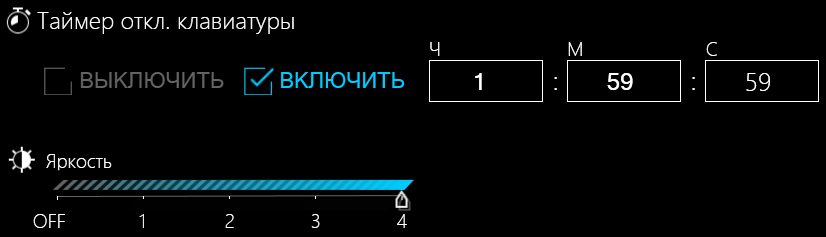 Справа внизу задаются четыре ступени яркости, можно и вовсе выключить подсветку, установив движок в «Off». Чуть выше находится управление таймером автоотключения подсветки после определенного интервала бездействия, задаваемого в часах-минутах-секундах вплоть до 1:59:59, с последующим включением после нажатия любой кнопки. Таймер можно и отключить, тогда подсветка будет постоянной.