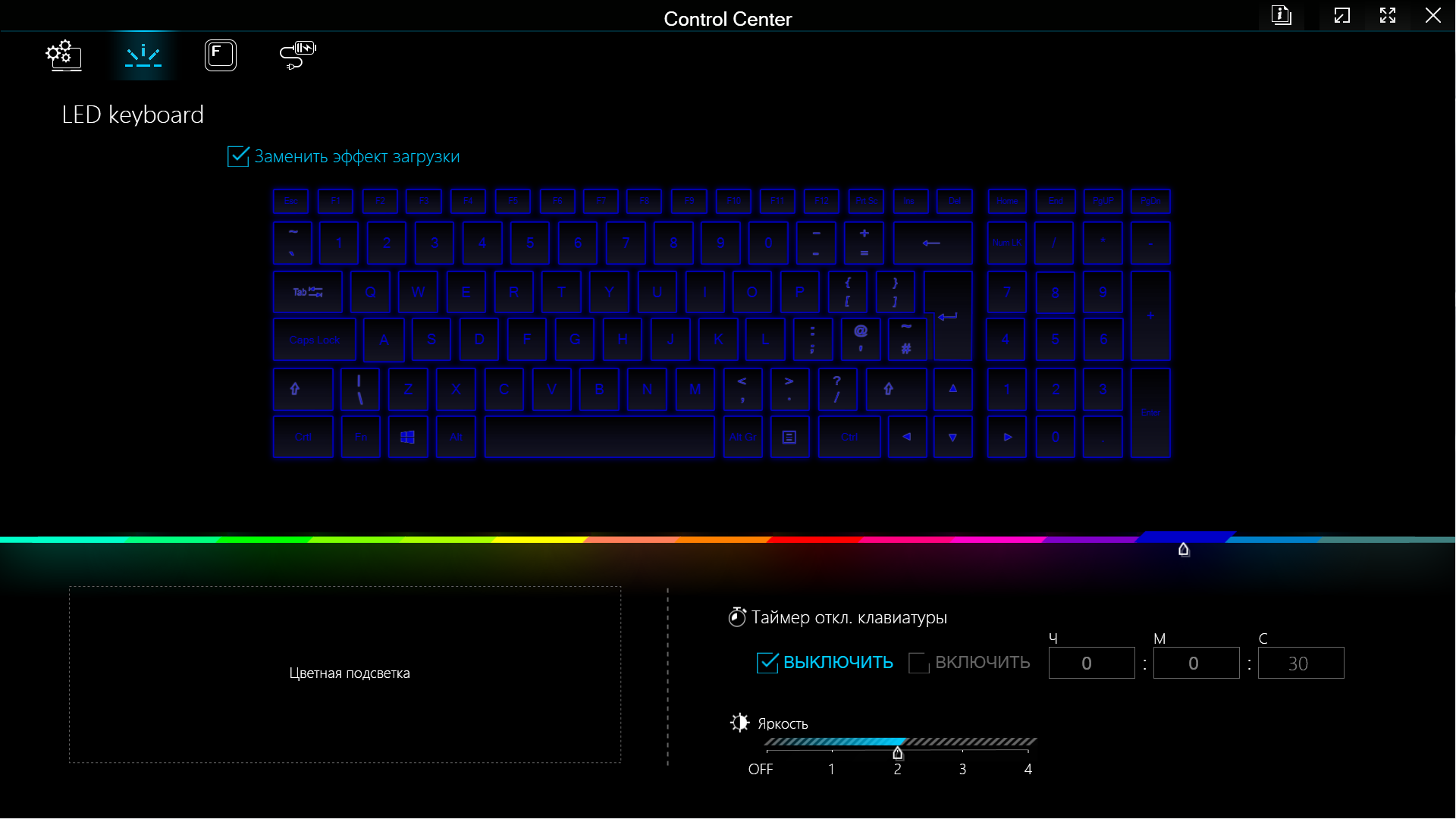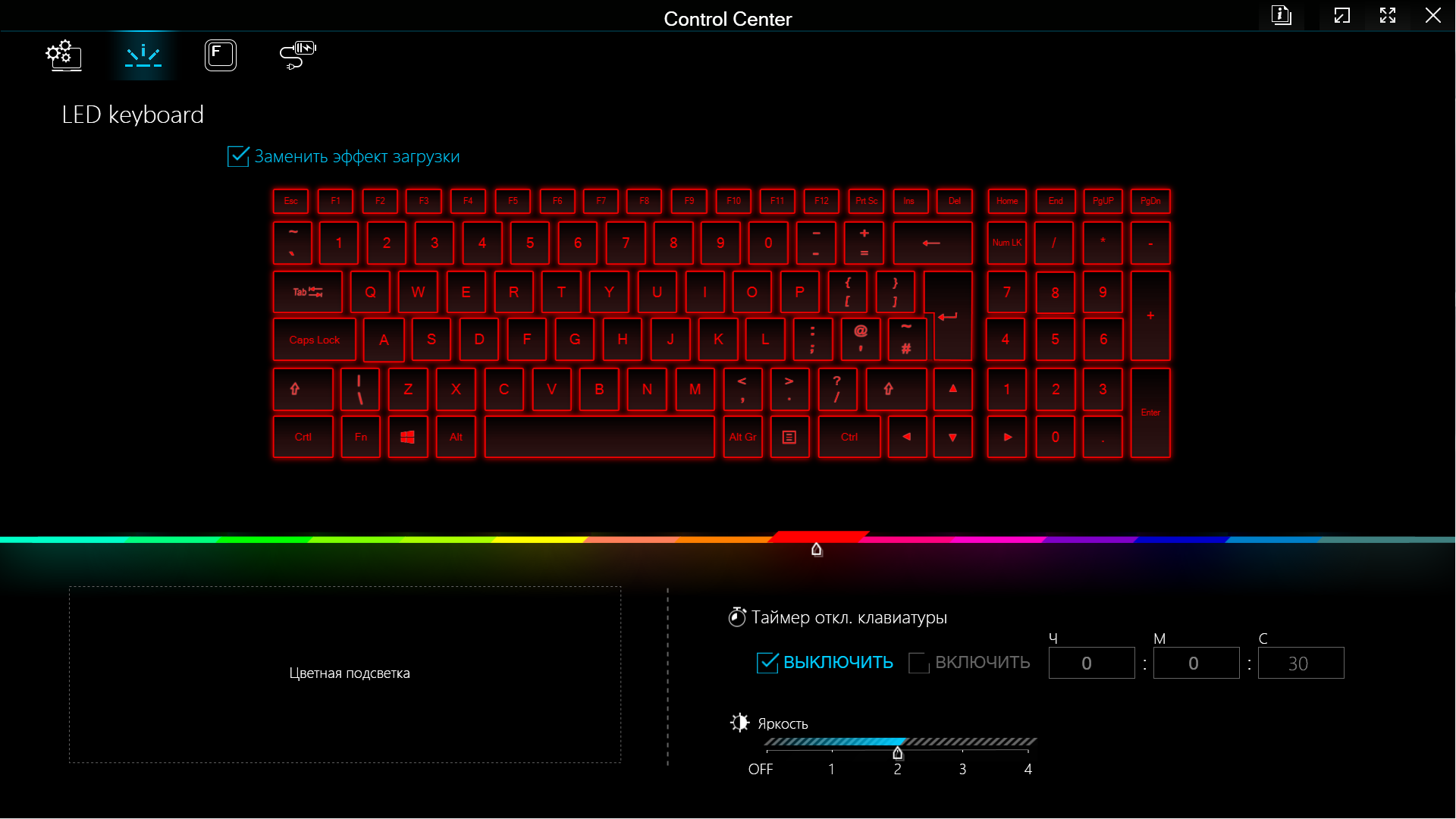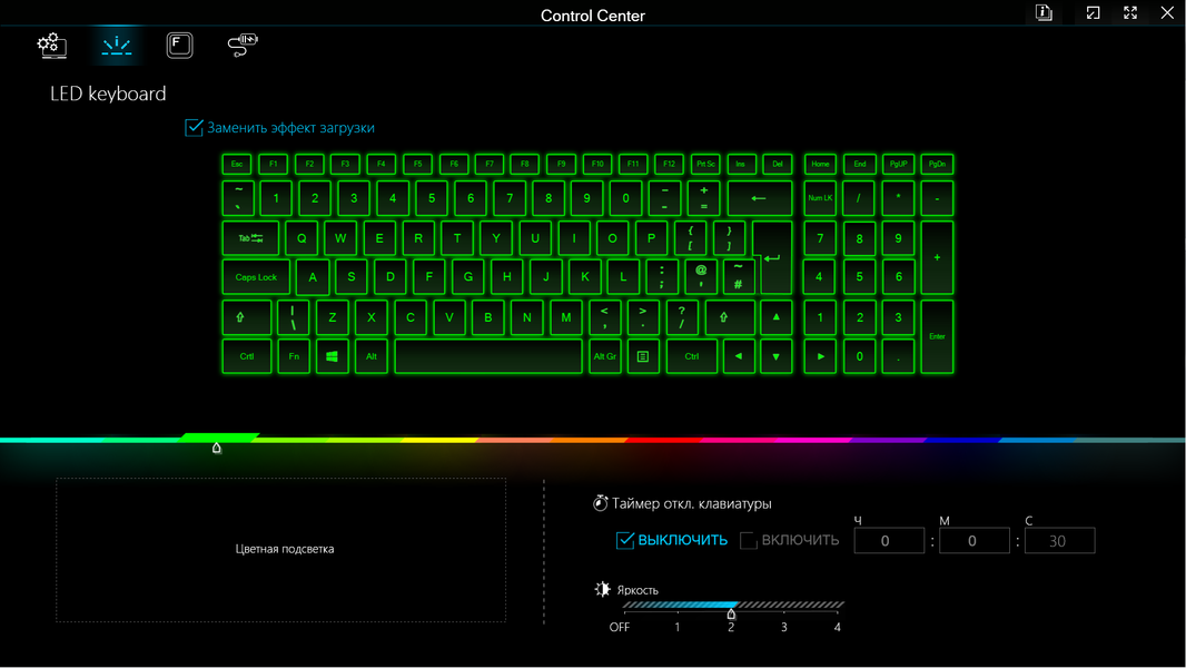 Вторая кнопка в левом верхнем меню «LED keyboard» управляет подсветкой клавиатуры и декоративной полосы на заднем торце корпуса. Самое заметное — задание цвета (для всех клавиш и всей полосы разом, какие-либо эффекты не предусмотрены).
