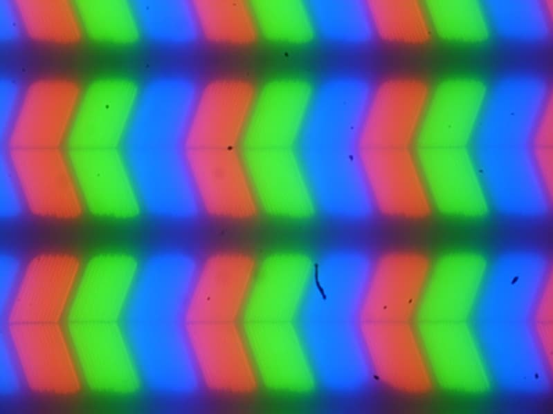 Внешняя поверхность матрицы черная жесткая и полуматовая (зеркальность выражена). Какие-либо специальные антибликовые покрытия или фильтр отсутствуют, нет и воздушного промежутка. При питании от сети или от батареи и при ручном управлении яркостью (автоматической подстройки по датчику освещенности нет, хотя датчик, вроде бы, и есть) ее максимальное значение составило 386 кд/м² (в центре экрана на белом фоне). Максимальная яркость довольно высокая, поэтому за ноутбуком как-то можно будет работать/играть на улице ясным днем, если расположиться в тени.