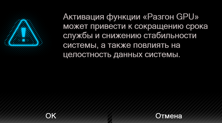 Еще интересно было бы опробовать влияние предусмотренного утилитой Control Center для профиля «Производительность» разгона видеокарты. Ставим максимально возможные значения для GPU и видеопамяти, при этом выдается вот такое предупреждение: