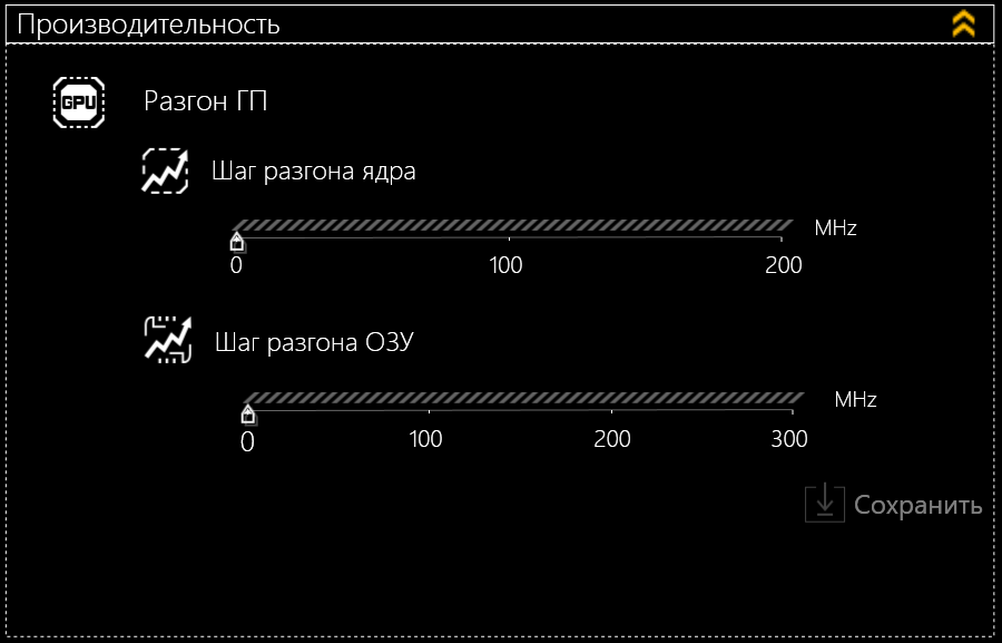 Для производительного режима предусмотрена возможность разгона видеокарты — и ядра GPU (на 100 или 200 МГц), и видеопамяти (на 100, 200 или 300 МГц).