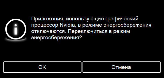 При выборе энергосберегающего профиля происходит переключение на принудительное использование интегрированного видеоадаптера, появляется такое предупреждение: