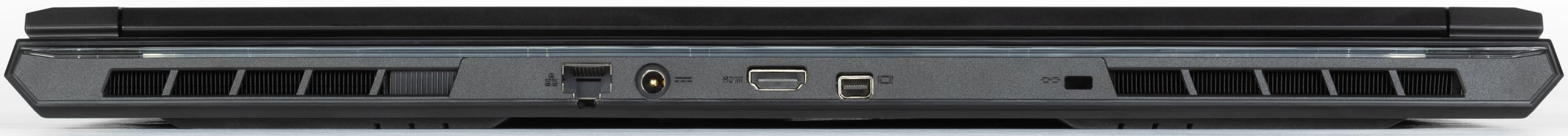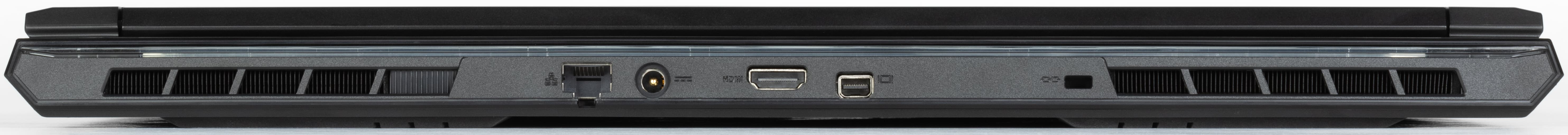 На заднем торце имеются разъем RJ-45, гнездо питания, порты HDMI и Mini-DP, а также отверстие кенсингтонского замка.