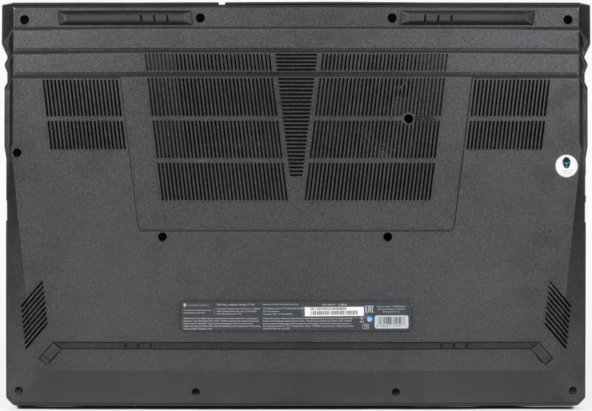 На днище, кроме четырех ножек (сзади побольше, спереди совсем маленькие), ближе к задней кромке имеются решетчатые области, через которые происходит забор воздуха для охлаждения компонентов, поэтому ставить ноутбук на мягкую поверхность не следует.