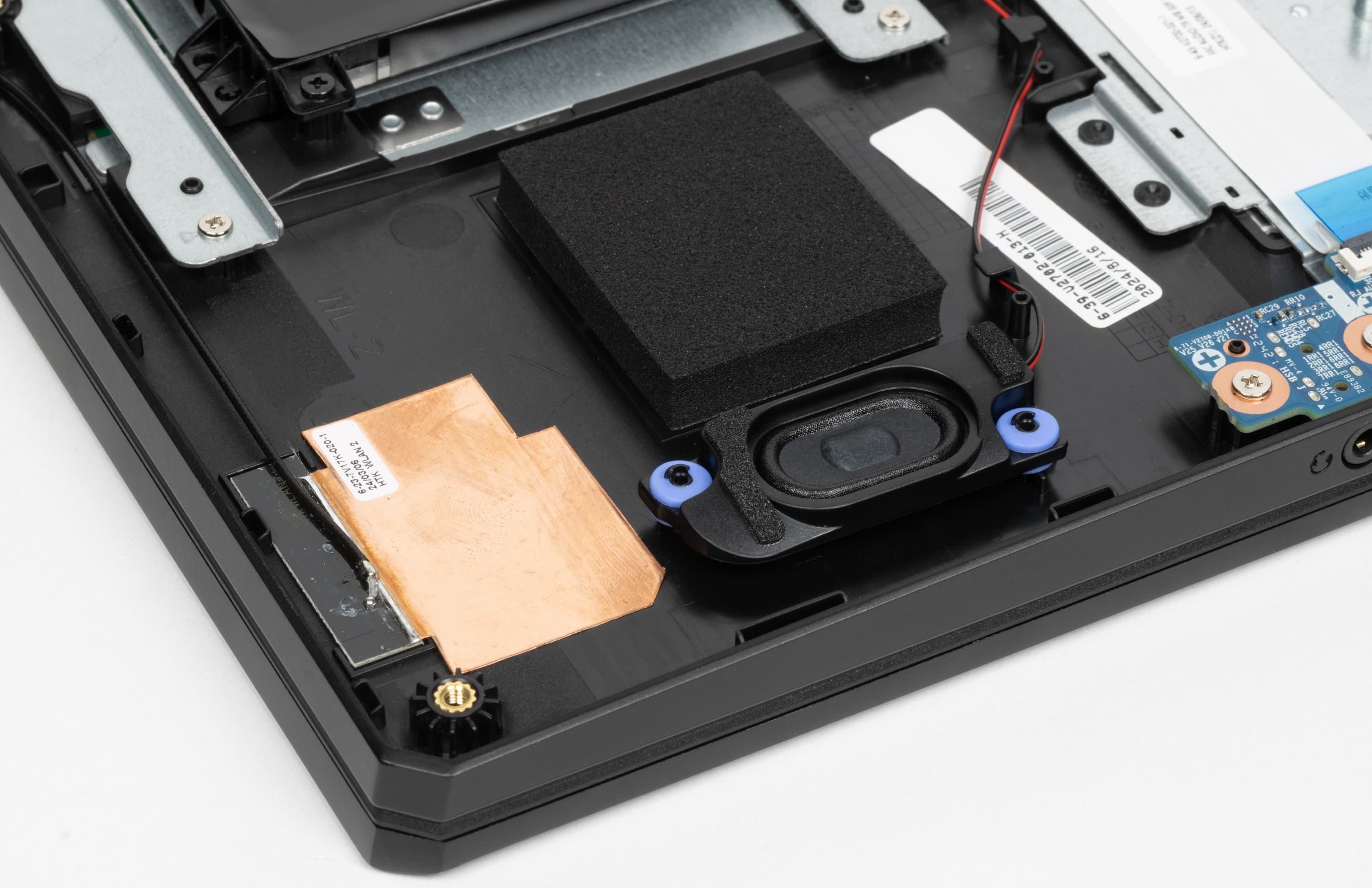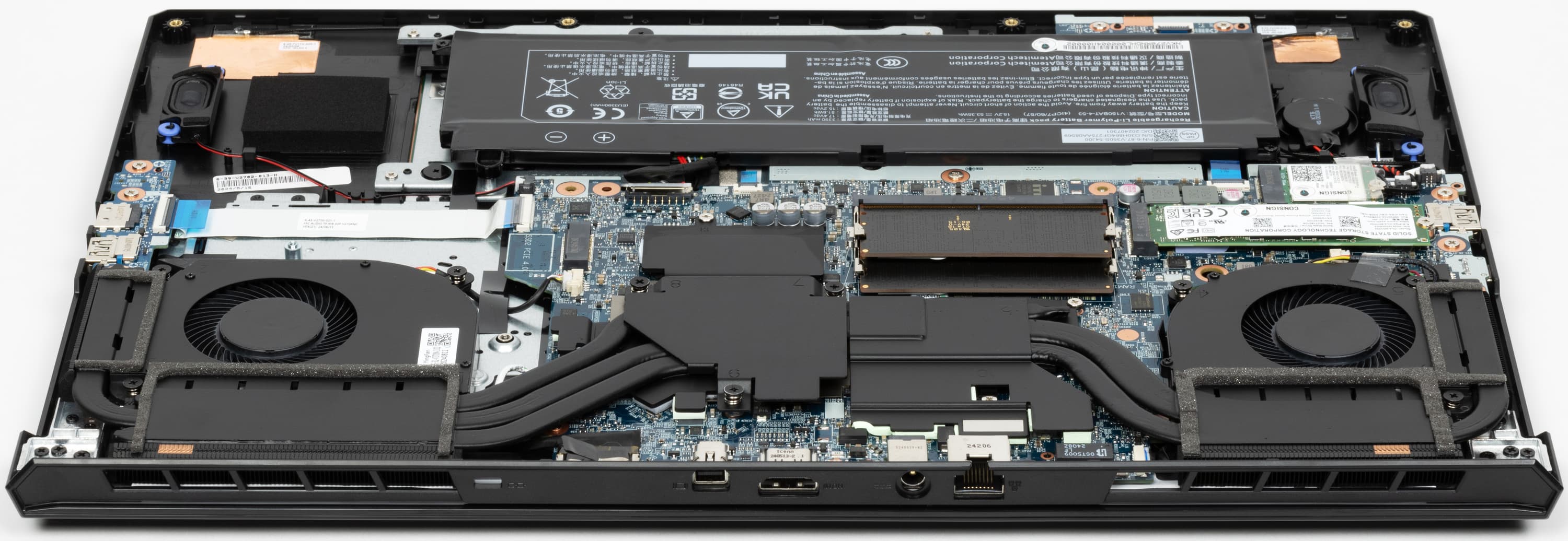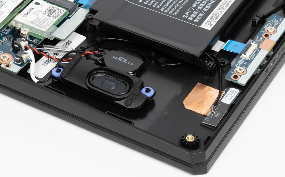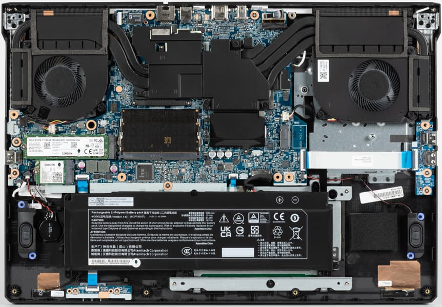 Больше всего места внутри ноутбука занимает системная плата с кулерами, немалая часть отведена под батарею, по бокам которой находятся динамики.