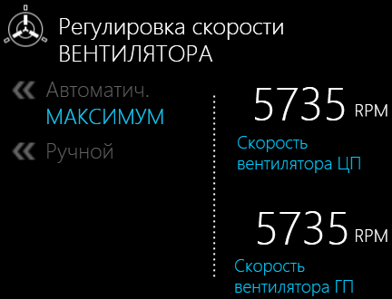 В автоматическом режиме клик по слову «Максимум» заставит оба вентилятора постоянно работать на максимальной скорости — около 5700 оборотов в минуту. Отменить это можно кликом по «Автоматич.».