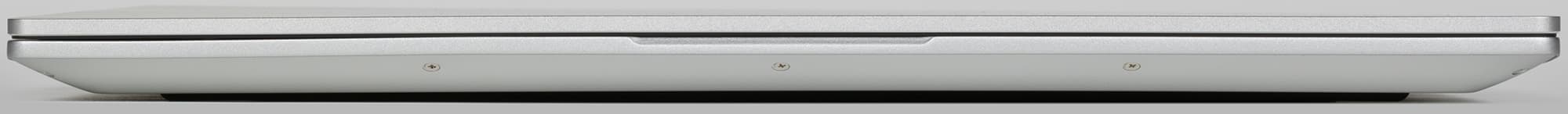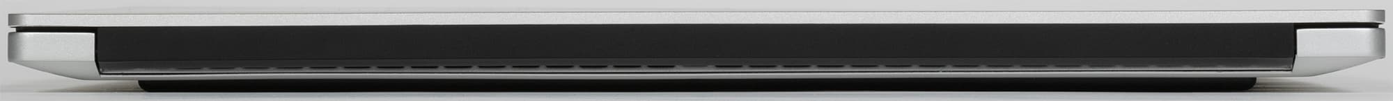 Черная пластиковая рамка вокруг экрана довольно тонкая: по бокам 3,9 мм, вверху 7,1 мм (там расположена веб-камера с индикатором, но без шторки, и микрофоны), внизу 9,7 мм до изгиба крышки, закрывающего петли. С трех сторон около миллиметра добавляет наружная пластина, но зрительно это не увеличивает толщину рамки из-за контраста цветов (черный и серебристый).