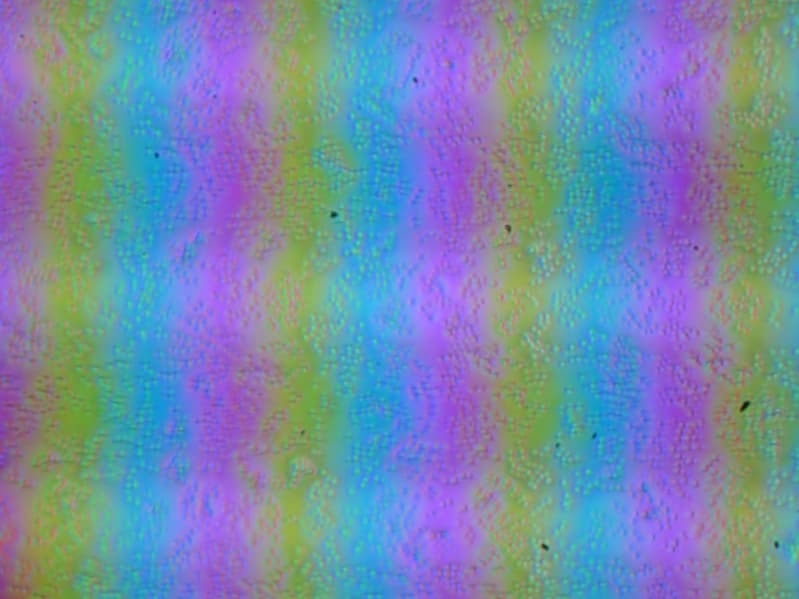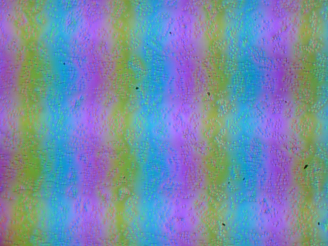 Зерно этих дефектов в несколько раз меньше размеров субпикселей (масштаб этих двух фотографий примерно одинаковый), поэтому фокусировка на микродефектах и «перескок» фокуса по субпикселям при изменении угла зрения выражены слабо, из-за этого нет и «кристаллического» эффекта.
