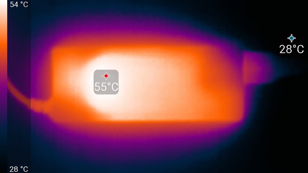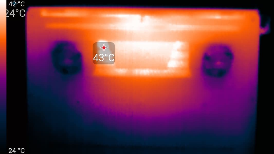 На заднем торце корпуса идет ряд более крупных отверстий, через которые система вентиляции выбрасывает нагретый воздух. Как часто бывает в подобных конструкциях, получается подогрев нижней части экрана, но во время запуска «тяжелых» тестов выяснилось: не особо сильный.