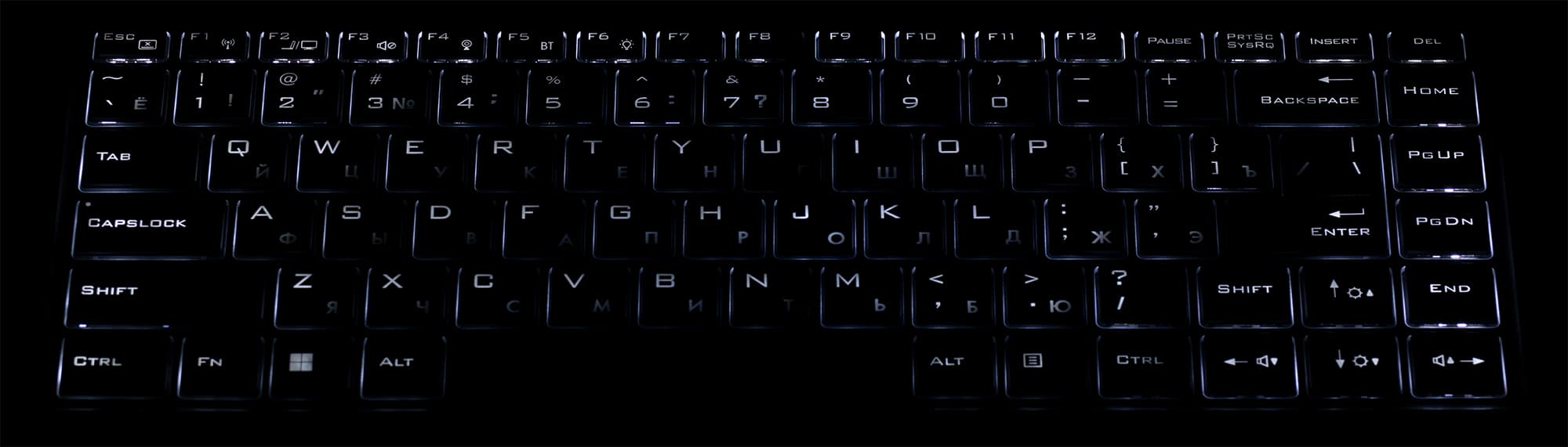 Предусмотрена отключаемая подсветка — белая, с двумя уровнями; даже на максимуме очень уж яркой ее не назовешь. Встроенный индикатор есть только в кнопке CapsLock для отображения соответствующего режима.