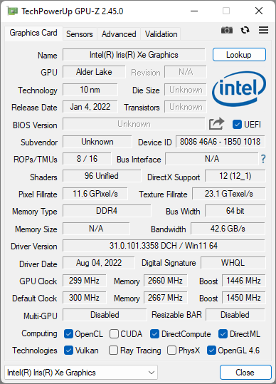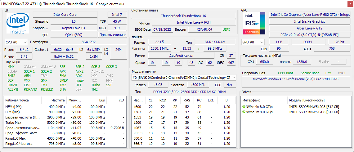 | Видеоподсистема | интегрированная графика Intel Iris Xe Graphics (Alder Lake-P GT2) | |