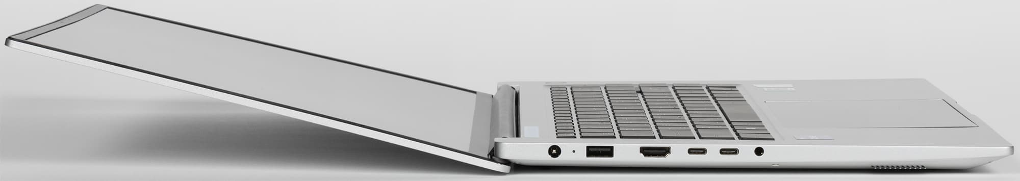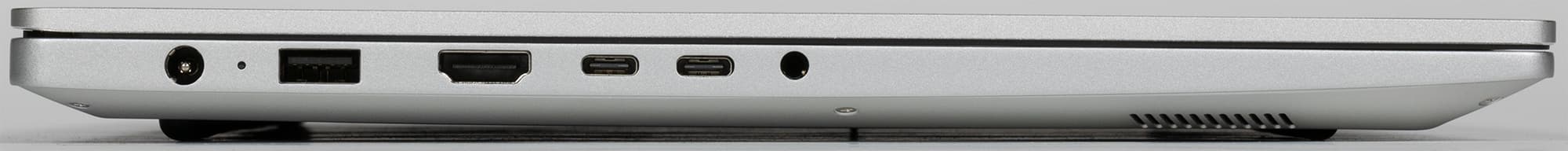Слева набор богаче: гнездо питания с индикатором, еще один порт USB3 Gen1 Type-A, полноразмерный HDMI, а также пара портов USB3 Gen2 Type-C и комбинированный миниджек для аудиогарнитуры. Индикатор горит белым при включении, мигает медленно в режиме сна или при заряде без включения ноутбука, мигает быстро при малом остатке заряда; при нормальном расположении оператора этот индикатор не виден, приходится смотреть сбоку.