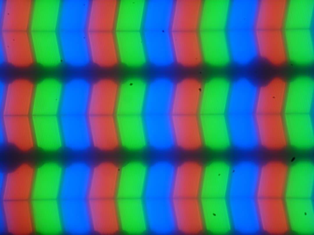 В этом ноутбуке используется матрица типа IPS. Микрофотографии демонстрируют типичную для IPS структуру субпикселей (черные точки — это пыль на матрице фотоаппарата):