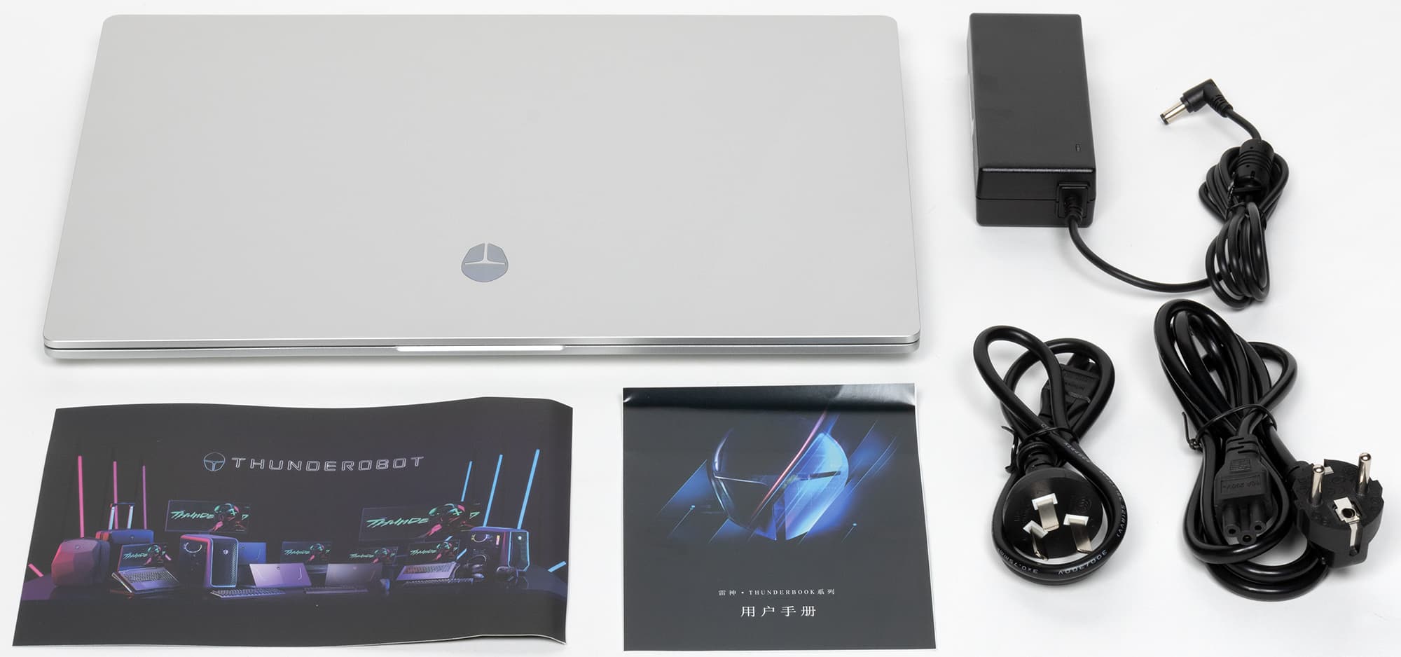 В комплекте, кроме самого ноутбука, идет только блок питания со сменным входным кабелем (длина 1,4 метра, их два — с разными вилками) и распаянным выходным (1,5 м), а также две небольшие книжечки с информацией на китайском языке.