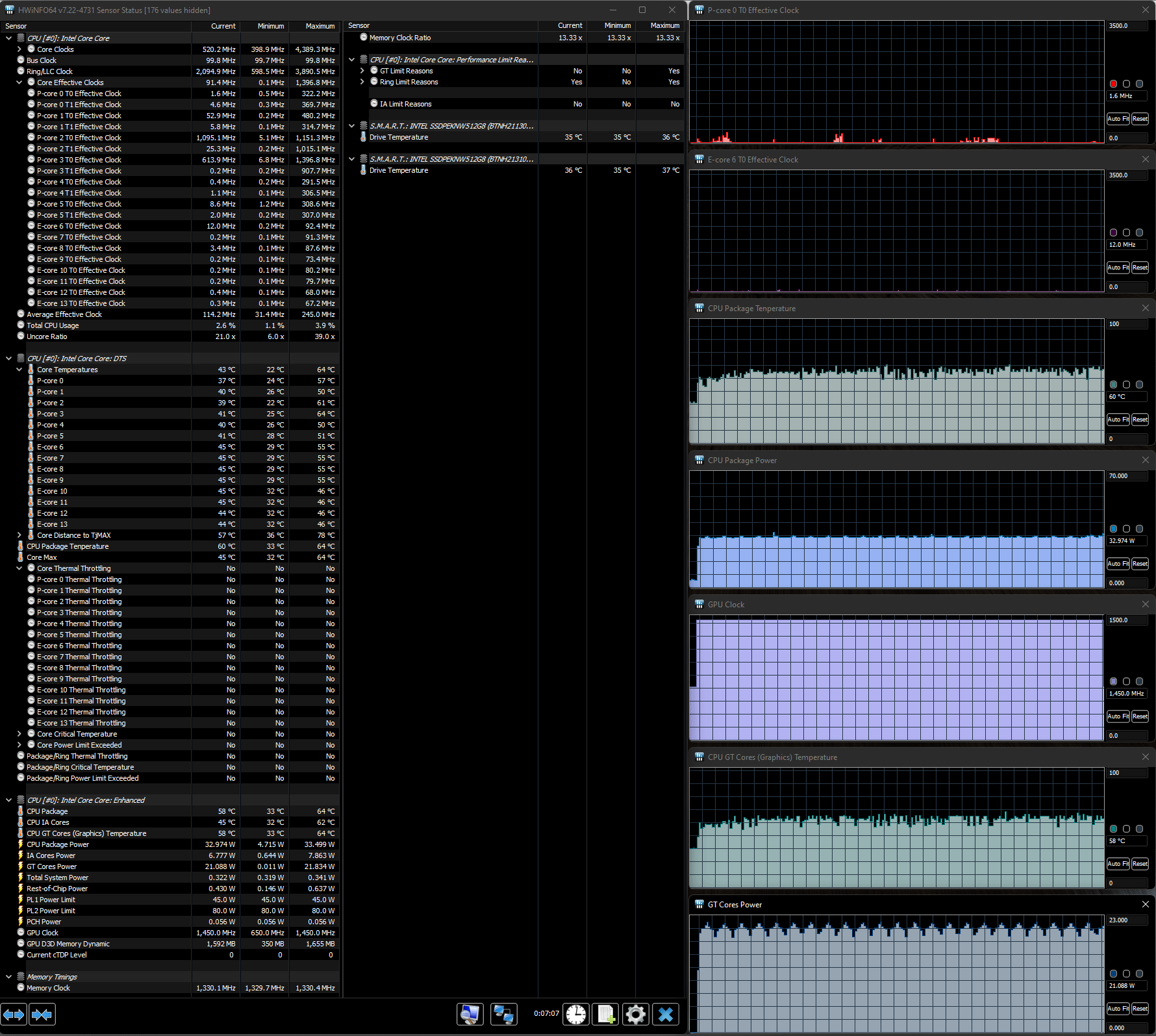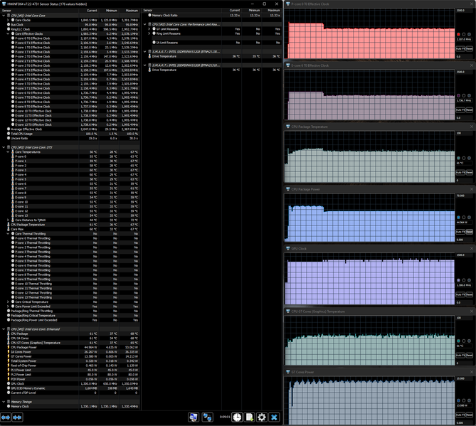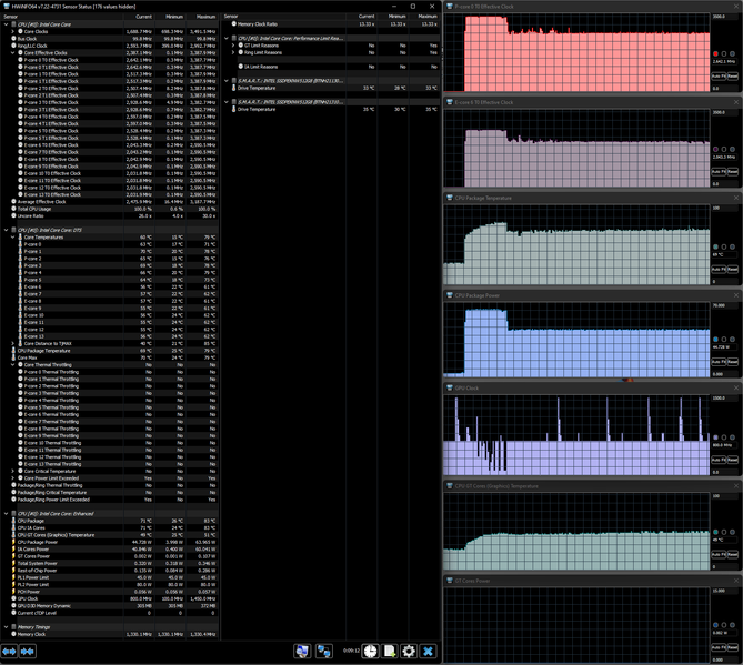 При подаче нагрузки (программа powerMax) на процессор его потребление на период чуть более минуты поднимается до 64 Вт, частота P-ядер — до 3,1 ГГц, Е-ядер — до 2,6 ГГц, температура растет, достигая 79 °C. Вентиляторы наращивают скорость вращения до максимума и остаются в таком режиме до конца теста. Затем Turbo Boost отключается, перечисленные параметры скачком снижаются и фиксируются на уровнях 69 °C, 45 Вт, 2,7 ГГц и 2,1 ГГц. Перегрева и тротлинга не наблюдается.